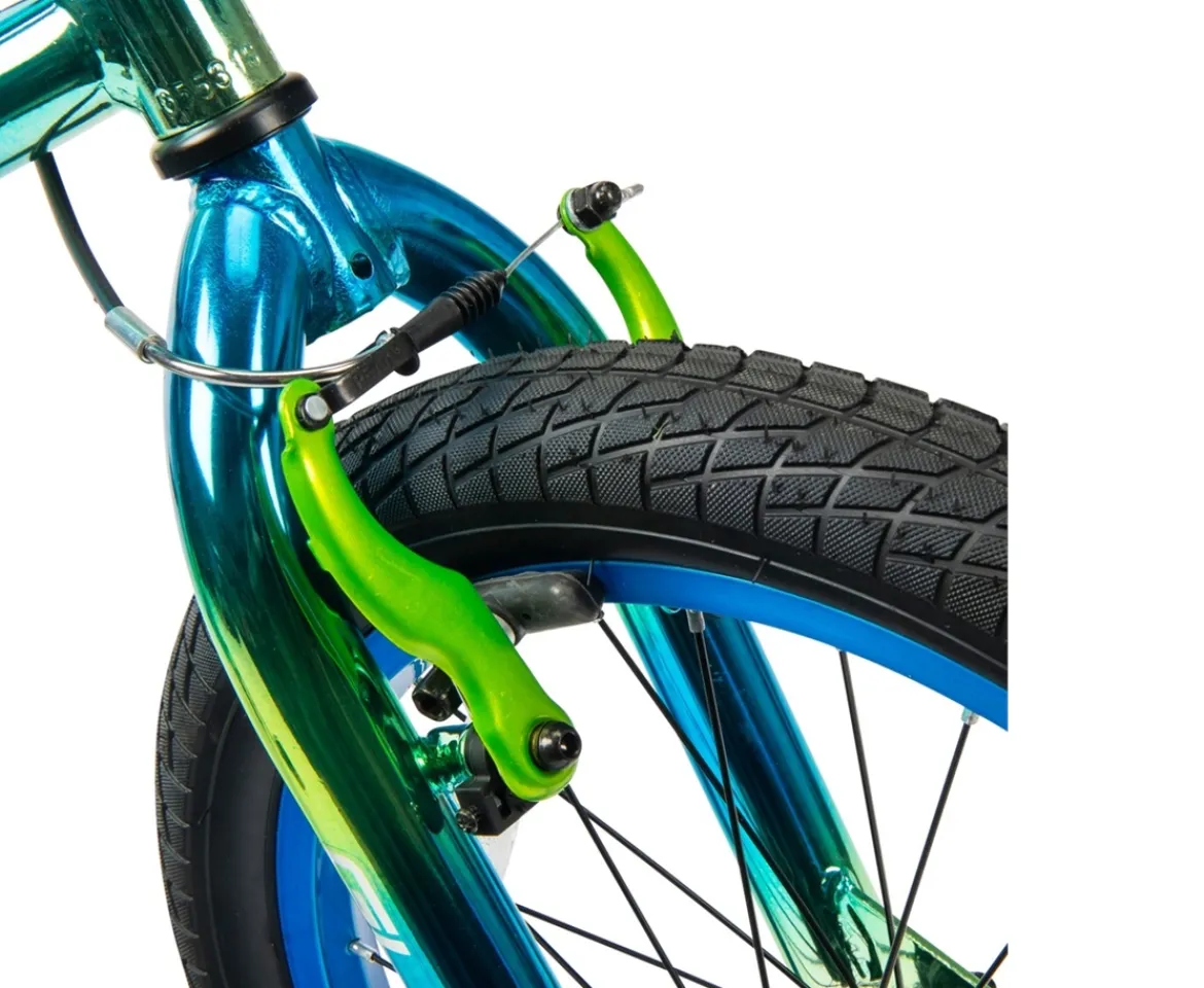 Futuristic style makes the 18 Inch Glitch bike stand out from the crowd. This unique kids’ bike comes decked out with contrast rims, a translucent chain guard and a vacuum-coated frame that fades from vibrant blue to metallic green.Travel further on an 18 inch bike with durable air pumped tyres and a strong steel frame. A kickstand keeps your new bike upright, while the pistol chain guard covers moving parts for safer cycling.The 18 Inch Glitch bike comes equipped with alloy V-brakes for safety, along with front and rear reflectors for added visibility.