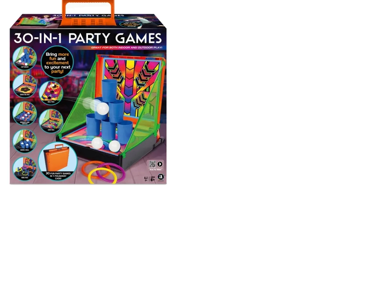 Enjoy hours of fun with the 30-in-1 Party Games Set! This easy-to-carry case features games for all ages, including bank-a-ball, tic-tac-toe and more! With memory games, racing and tossing games, tower building games and catching games, theres something inside for everyone!The giant travel case opens to create a sturdy game table, so you can play outdoors or from the comfort of home. Whether youre the host of game night, or celebrating a family get together, these games promise never-ending fun and challenges for every age and skill level!With a compact and easy-to-store design, this 30-in-1 games case is perfect for travel and on-the-go fun. Just open the case, choose your game and start playing! When youre finished, store the pieces back inside the case for simple clean up and storage.