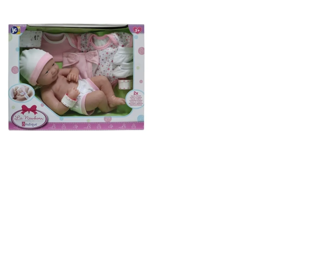 - Content: 1 Baby girl newborn doll, 2 nappies, pair of soft shoes, 2 outfits, hat and information band.