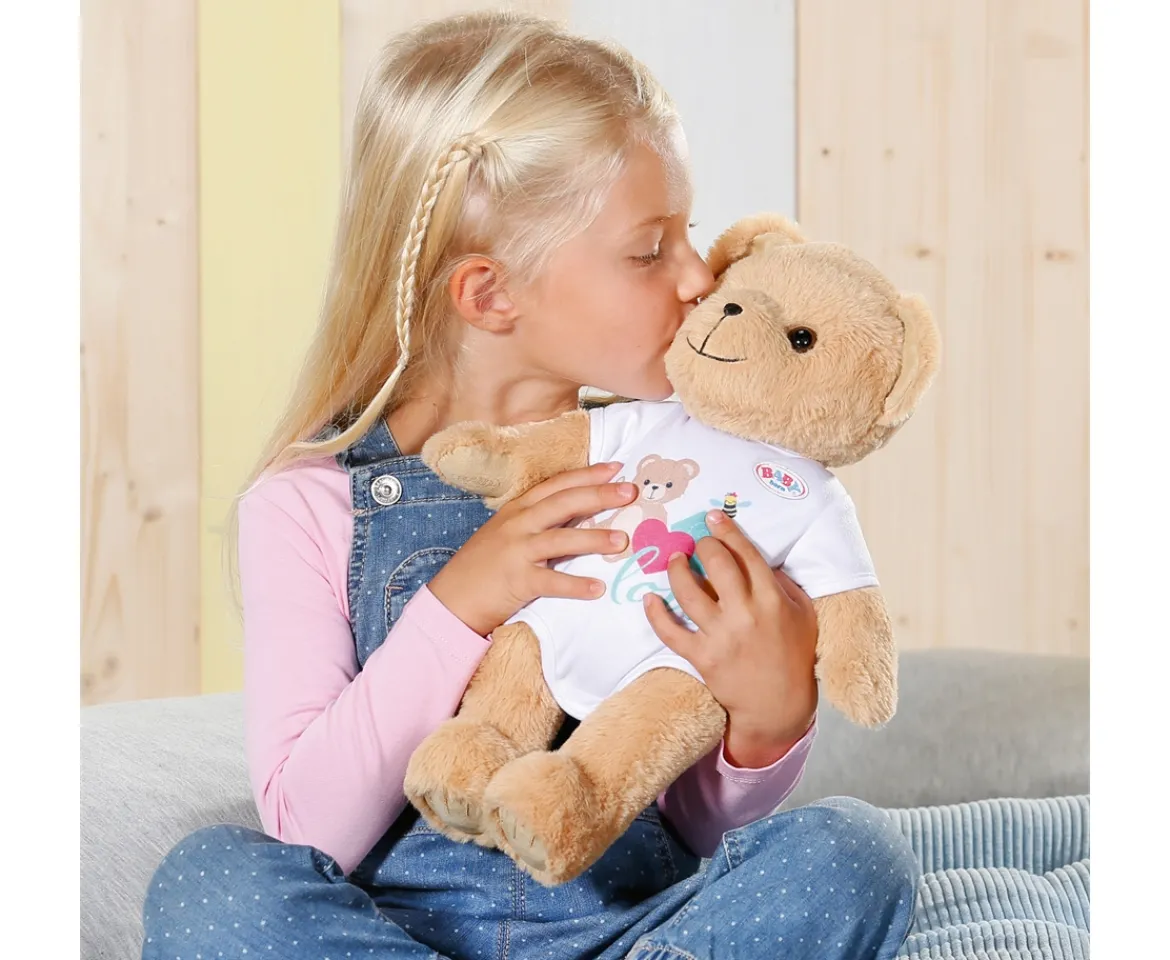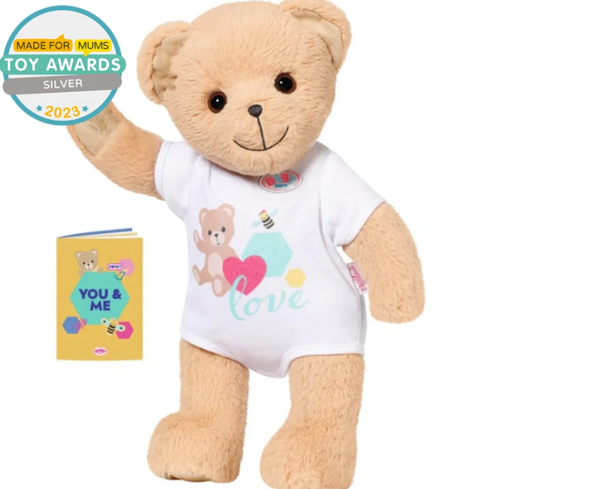 A new best friend for BABY born, the adorable BABY born Bear opens up a world of imaginative play for little ones. Together, BABY born and the Bear can go on so many adventures… they can have a fashion show, ride the same Scooter, share the same pushchair… the Bear has been designed to fit all of BABY born’s 43cm clothes and accessories! It’s soft, cuddly body is great for snuggles and the posable arms and legs make playing and changing clothes even more realistic.BABY born Bear comes dress in a lovely white romper and also has a friendship booklet where the child can pick the Bear’s name, birthday, favourite foods and activities!Little ones aged 0+ will love adding the Bear into their BABY born family for endless love and adventures alongside their favourite doll. Suitable for children aged 0+. For enhanced and long-lasting fun through imaginative play with dolls and plush toys. Comes in 100% plastic free packaging.