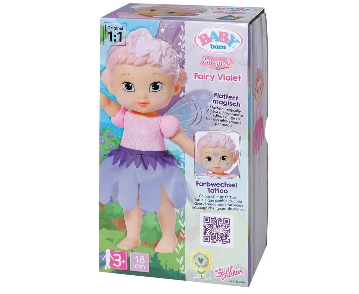 Welcome to the world of BABY born Storybook! Adventure inside and you will meet Fairy Violet, the most creative of the Storybook fairies. Wearing a lovely purple dress with tutu skirt, she has magical face art that reveals itself in sunlight. Fairy Violet also comes with a magic wand that makes her fairy wings flutter when you swish it over her tummy!As the name suggests, the Storybook world is all about using your imagination to create stories of all the characters you will meet. Fairy Violet lives in a snail shell next to the river in Storybook world, with her best friend the deer. She loves to make the most wonderful perfume scents with all the flowers she finds. To bring the Storybook world to life, Fairy Violet comes with a picture booklet showing an adventure she has with the other fairies in this magical world, which little ones can make their own words to. She also comes with a stand to place her on which has a double-sided backdrop; one side has a day scene and the other a night scene, to encourage little ones to create even more magical stories in this wonderful world! BABY born branded fairy doll.18cm tall with fluttering wing function and colour-changing face print.Includes stand to place Fairy Violet on, with LED light.Comes with her own Storybook adventure picture booklet. 6 Storybook fairies to collect!BABY born Storybook Fairy Violet 18cm with magic wand, stand with backdrop and picture booklet.