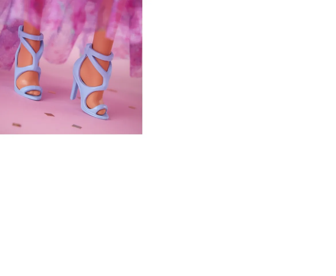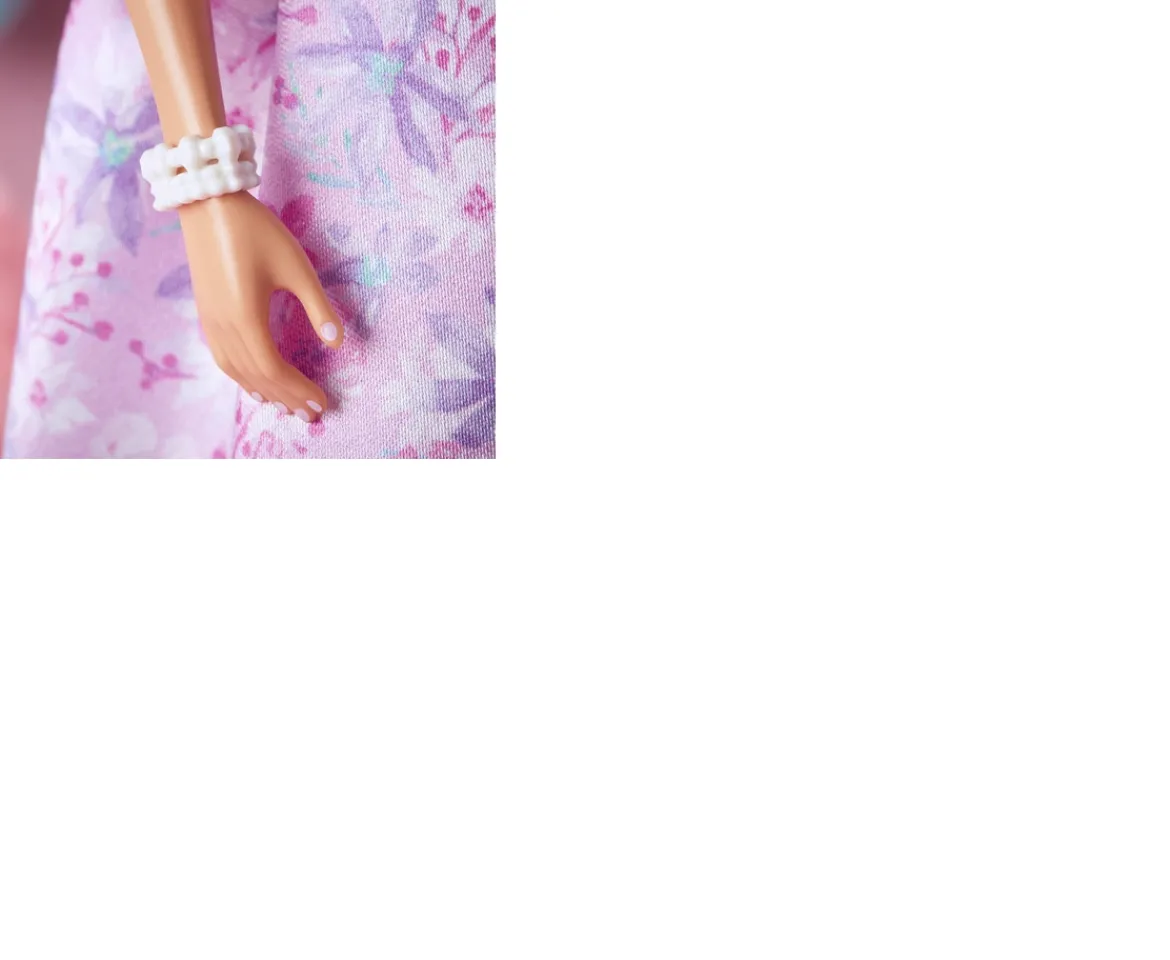 - Barbie doll wears a lilac satin dress with a dreamy floral print. Ruffled shoulder straps and a sky-blue ribbon at the waist add luxe detail to her bouquet-inspired look.