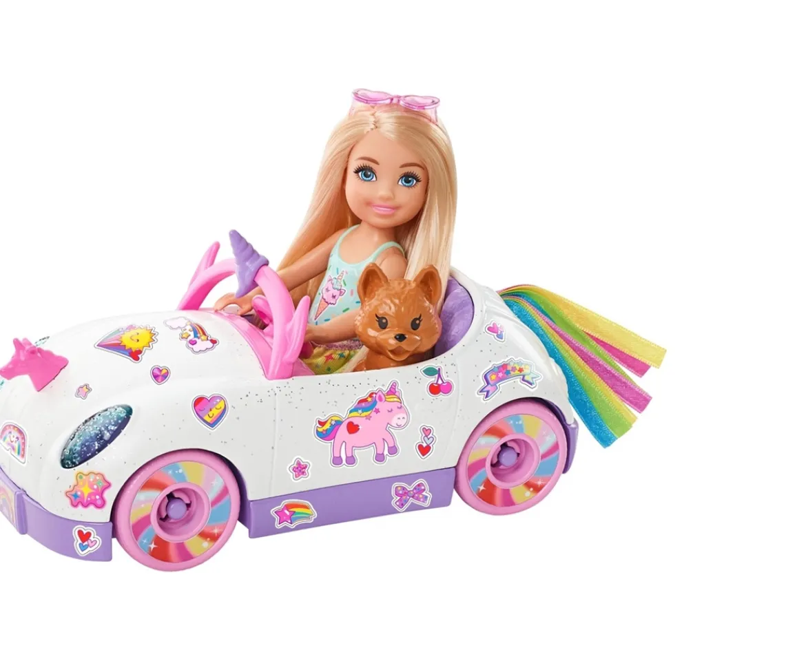 Young imaginations will find endless playtime possibilities with this Barbie unicorn-inspired car which comes with a Chelsea doll and puppy toy! This adorable open-top Barbie vehicle is glittery white with purple detailing and includes a unicorn-themed hood ornament and rainbow streamer tail!Use the Barbie sticker sheet to customise the car with more cute decorations! Seat the Chelsea doll toy and her puppy friend in the car and take them on all kinds of fun adventures! This Barbie Chelsea playset makes a great gift for ages 3+.