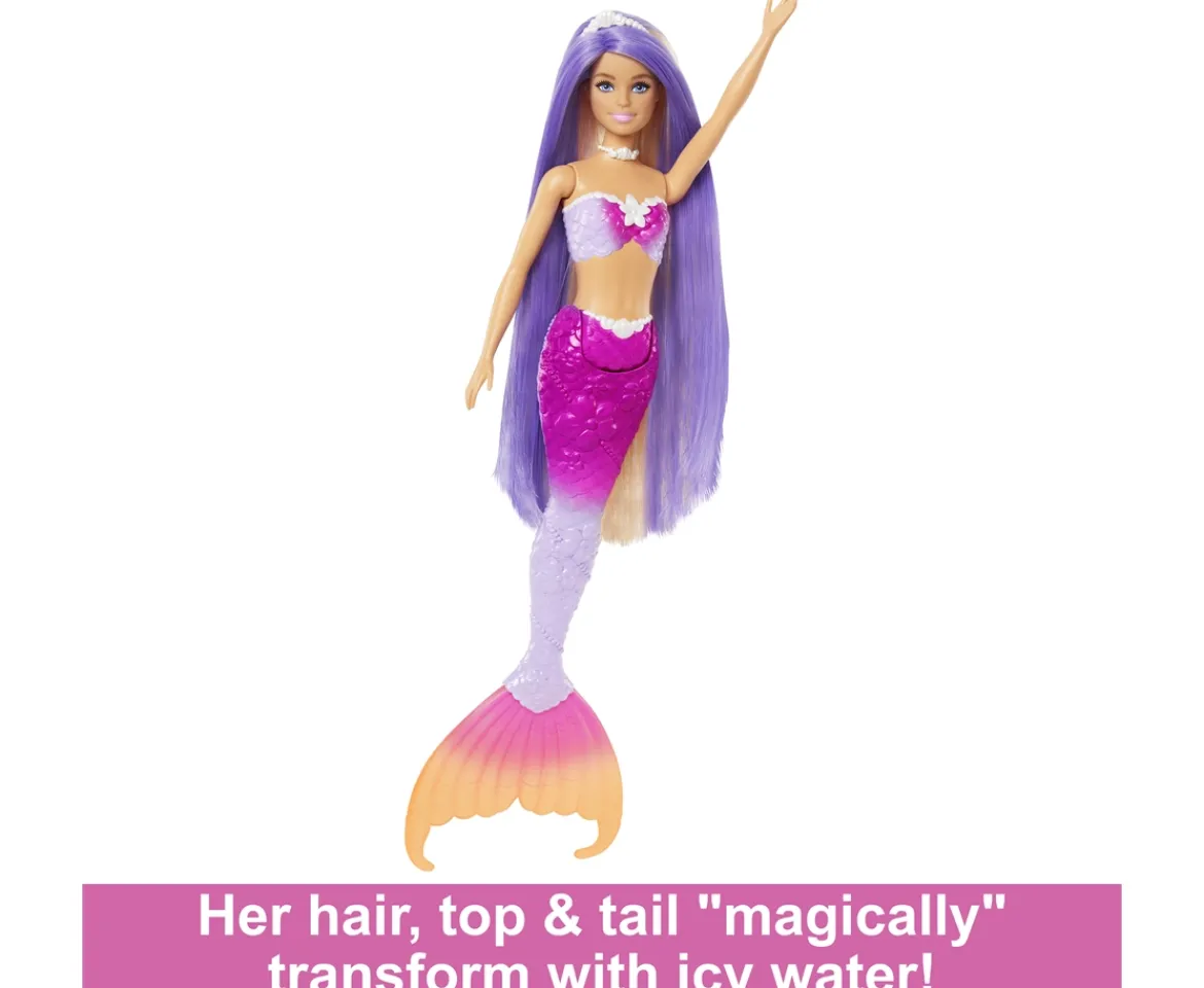 Playtime has been transformed into pure magic with the Malibu Barbie Mermaid Colour Changing doll! Enchanted by the touch of water, this mermaids ombre tail, bodice, and long flowing hair change from bubblegum pink to vibrant purple and back again!Now it’s time to style Barbie Malibu with accessories and comb her luscious locks. And her pet dolphin is there to keep her company when she takes a dip!