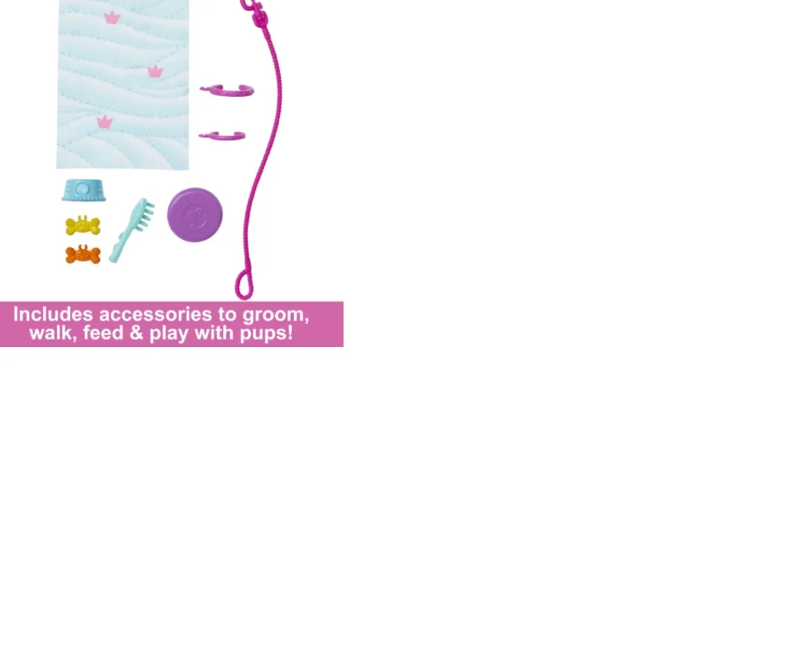 Fall in puppy love with Barbie and this doggy duo! This playset includes a puppy and a big dog that has a supportive wheelchair with working wheels. These best buds love taking walks with Barbie doll! Kids can remove and reattach the wheelchair to the pup who just needs a little extra love and care. With accessories like a food bowl, collars, pet bed, and a leash that really fits in doll hands, Barbie doll has everything she needs to take care of her fur-ever friends! Doll cannot stand alone. Colors and decorations may vary.
