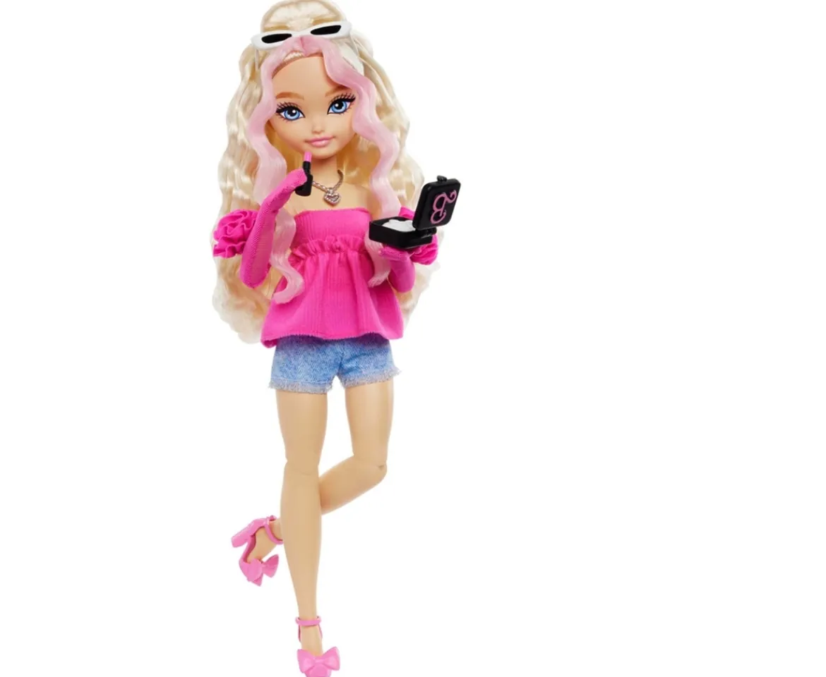 The Barbie Dream Besties Barbie ‘Malibu’ doll inspires kids to share their unique talents with the world. With dreams of owning her own makeup company, Barbie ‘Malibu’ comes equipped with 11 beauty-themed accessories, including a hairdryer, mirror, and lipstick, making playtime both creative and fun.Dressed in a stylish pink peplum top, denim shorts, and heels, she also features long, wavy blonde hair with a touch of pink for added flair! Fully posable for dynamic posing and playability. Doll cannot stand alone.