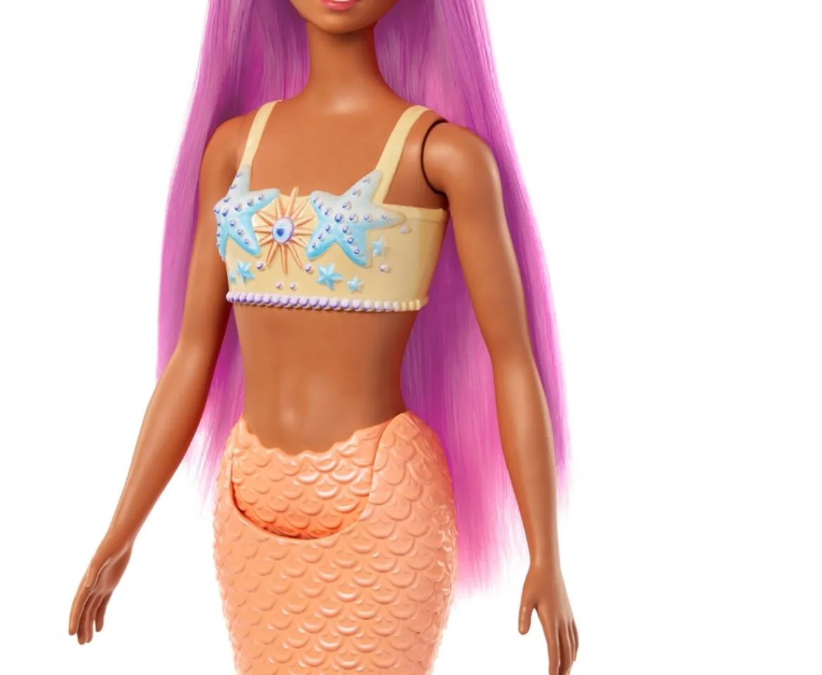 Dive into an enchanting under-the-sea adventure with the Barbie Dreamtopia Mermaid Doll! This Barbie mermaid doll features stunning pink and purple hair, adorned with a teal green tiara and a starfish- inspired bodice, she brings enchantment to every underwater adventure. Complete with a peachy orange tail, this mermaid doll is ready to make a splash in your child’s imagination!