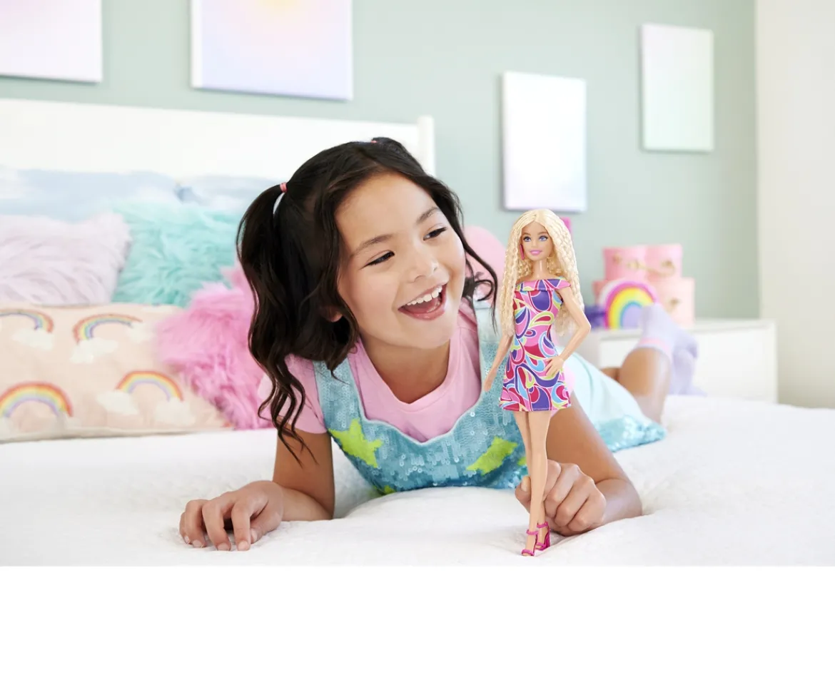 Commemorating 65 years of iconic fashion and signature style, Barbie Fashionistas dolls celebrate diversity and offer endless possibilities for storytelling and fashion exploration. This Barbie Fashionistas Doll wears a colourful dress with an eye-catching print inspired by her Totally Hair look from 1992!Her long blonde hair is crimped to celebrate the recognisable look, while her pink heels and bright pink earrings turn up the volume on this outfit! With an inclusive range of looks, kids can see how fun it is to express personality through style. And featuring today’s cool trends, Barbie dolls make an ideal gift for fashion-loving kids everywhere. Please note the doll cannot stand alone. Colours and decorations may vary.