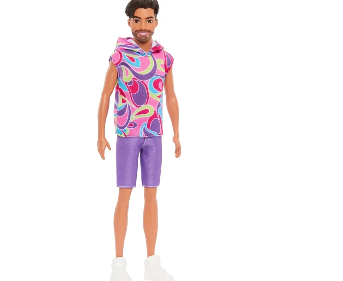 - Ken fashion doll wears an outfit inspired by the iconic 1991 Totally Hair look with a bright hoodie top featuring colorful graphic print. Sporty purple shorts and white sneakers turn up the volume!