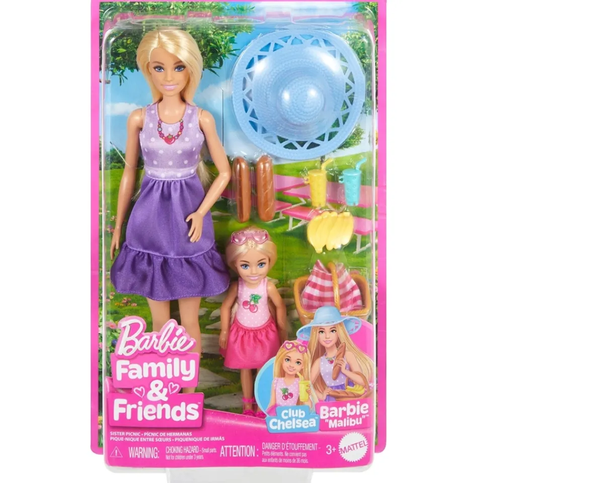 Join Barbie ‘Malibu’ and her little sister Chelsea for a fun-filled picnic adventure with the delightful Barbie Malibu and Chelsea Doll Family & Friend 2 Pack. Barbie shines in a stylish purple dress with matching shoes, while Chelsea looks adorable in her cherry-themed outfit and pink skirt.The set includes a picnic basket filled with baguettes, bananas, and drinks, plus a blanket for a cosy setup. Fashionable accessories like Barbies sunhat and Chelseas heart-shaped sunglasses adds an extra element of fun. Perfect for kids ages 3 and up, this set inspires storytelling and imaginative play, celebrating the bond between loved ones. Dolls cannot stand alone.