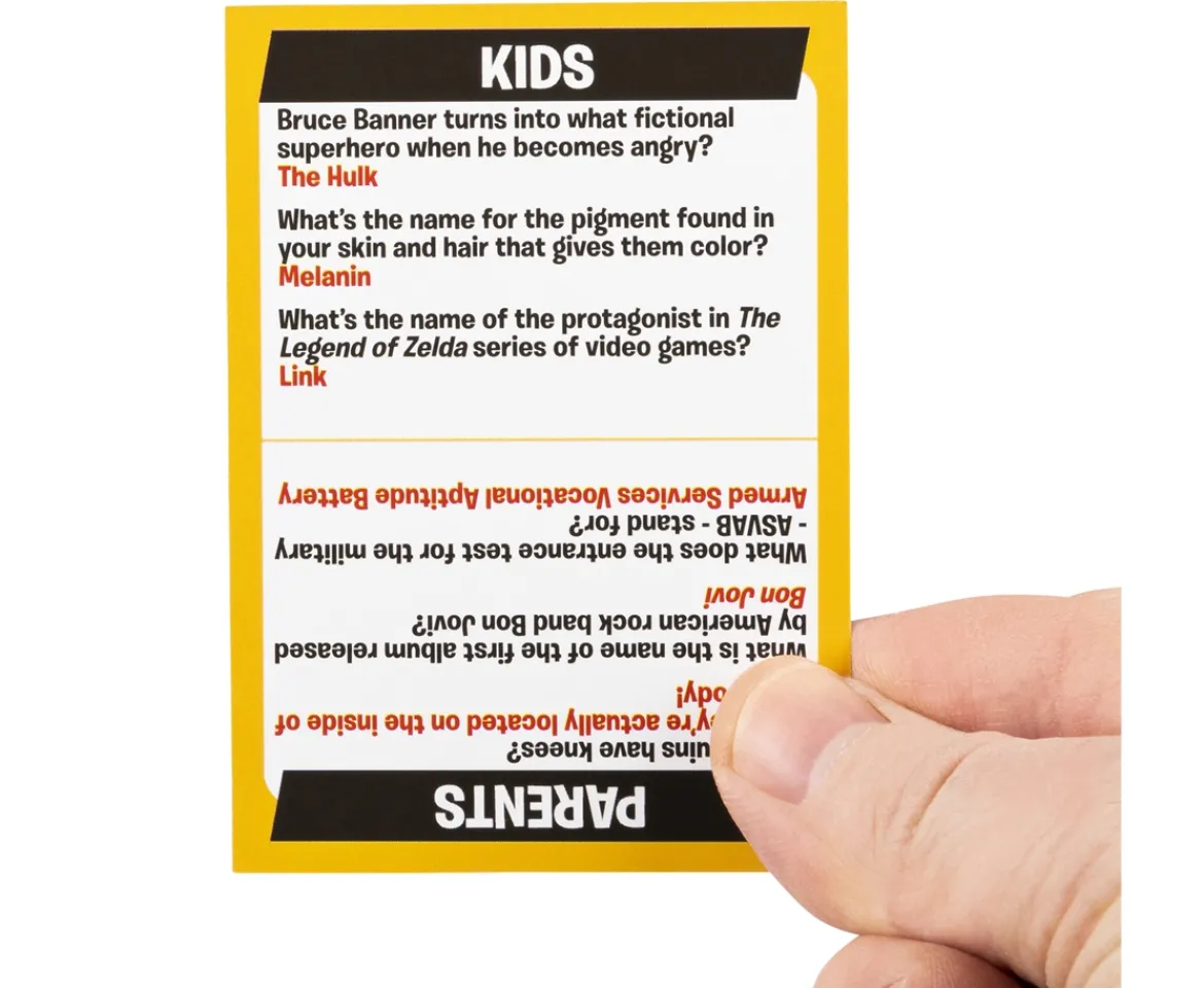 Go head-to-head in a battle of household supremacy with Beat the Parents, the fun-filled family trivia game! Prove who’s really the boss in this game of smarts and skills. Parents will have to answer questions about kids’ stuff, and kids answer questions parents should know. As teams answer trivia and move across the game board, they’ll encounter wacky challenges they need to complete.Things are bound to get competitive as teams name ice cream flavours, fly paper aeroplanes against each other, have a staring contest and more! The first team to get their mover to the other end of the game board wins! Get ready for the ultimate challenge of Kids vs. Parents with Beat the Parents!