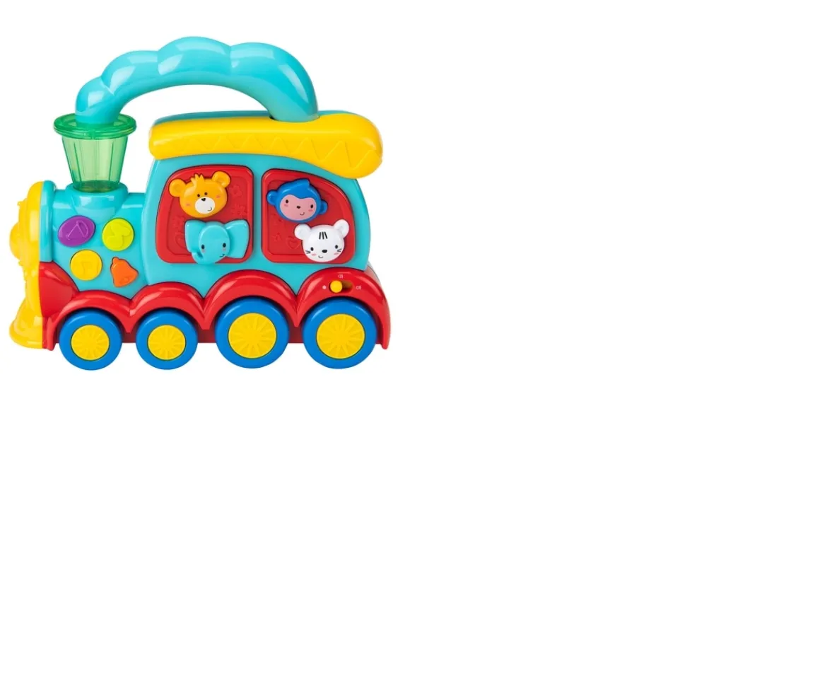 Choo choo! The Big Steps Play Baby Animal Train is a colourful baby toy with lots of fun animals on board.Press the bear, elephant, monkey and cat buttons to hear all the animals. The Big Steps Play Baby Animal Train plays 20 melodies and fun train sounds. See the chimney light up for even more sensory fun!The Big Steps Play Baby Animal Train supports baby’s curiosity, memory and concentration skills. This colourful lights and sounds baby toy is designed to foster sensory development and hand-eye coordination.