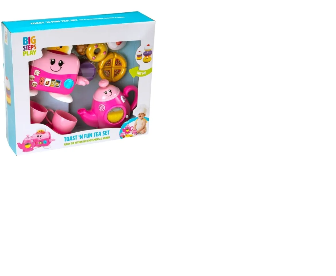 Whip up a yummy breakfast or afternoon tea with the Big Steps Play Toast ‘n’ Fun Tea Set. Little ones will love pretending to make toast for friends, serving treats at teddy bear picnics and playing teatime with their dolls.The teapot plays fun sounds when it’s poured, with pretty lights to reward role play fun. Press the teabag button to hear cheerful melodies play, bringing musical fun to teatime games. Serve up a yummy croissant or delicious doughnut, and use the button on the toaster to pop up some toast.The Big Steps Play Toast ‘n’ Fun Tea Set comes with 6 play food pieces and 2 cups and saucers for sharing with friends. Every toy is a storytelling opportunity, allowing children to develop self-expression and experiment with cause and effect.Children discover the world through play, exploring sounds, responding to bright colours and learning to recognise objects by touch. Acting out role play adventures with the Big StepsPlay Toast ‘n’ Fun Tea Set can help children to develop gross and fine motor skills, including put and take skills and hand-eye coordination.