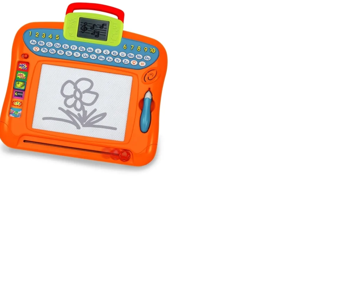 The Big Steps Play Write ‘n’ Learn Drawing Board introduces letters, numbers, art and music. This magnetic board features 6 interactive play modes with quiz games, spelling activities and more. Kids can draw pictures and write their letters using the stylus, then simply pull the tab to erase.The LCD screen displays fun animations as kids play. Press the 10 number buttons to learn about counting, or switch to music mode to transform the numbers into a 10-note keyboard. The Big Steps Play Write ‘n’ Learn Drawing Board has a button for each letter of the alphabet and plays a sing-along song to introduce ABCs.