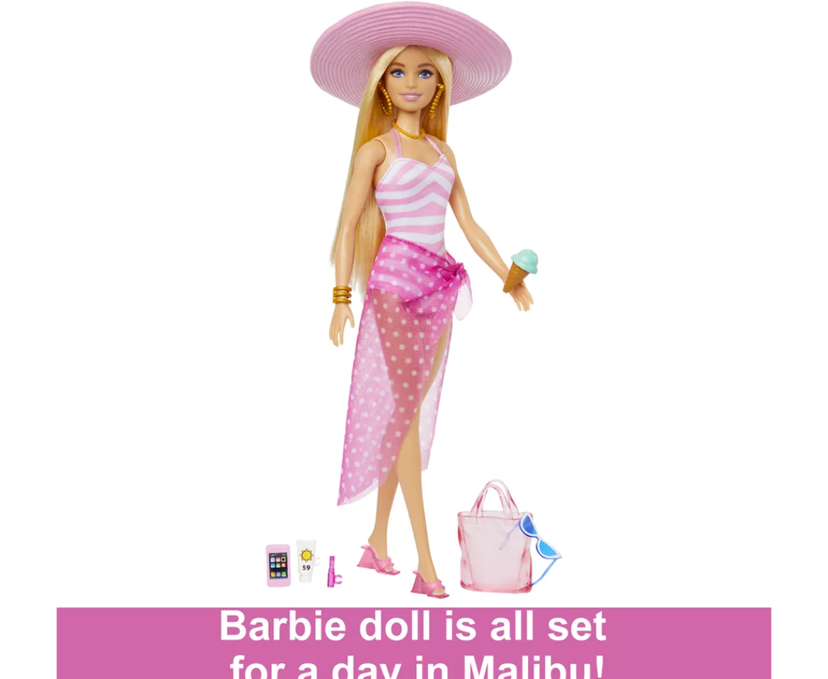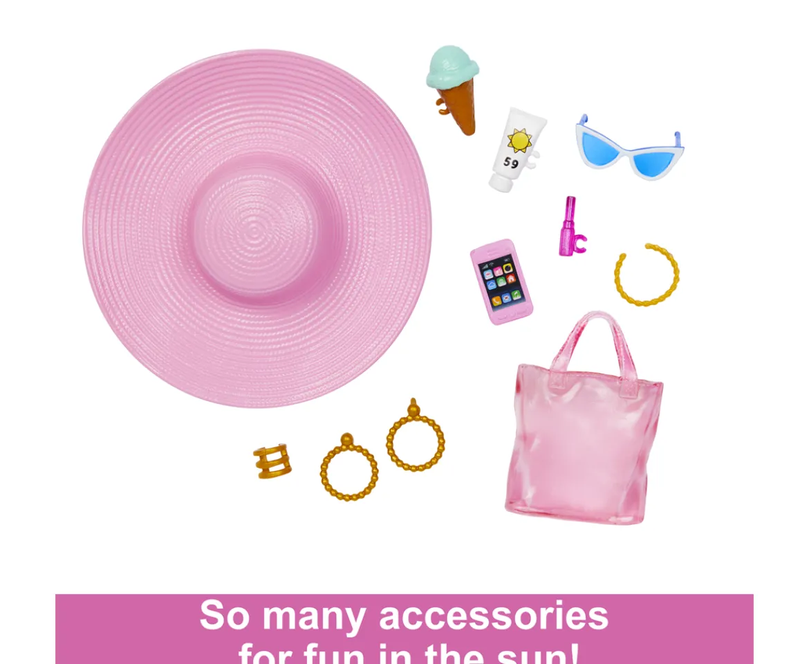 - Contents: 1 Barbie doll with swimsuit, 1 pair of sandals, 1 sarong, 1 hat, 1 tote bag and assorted small accessories