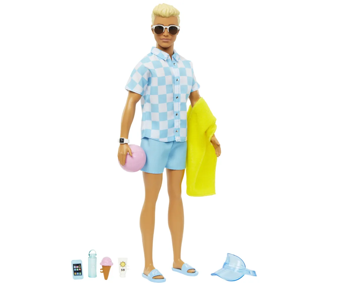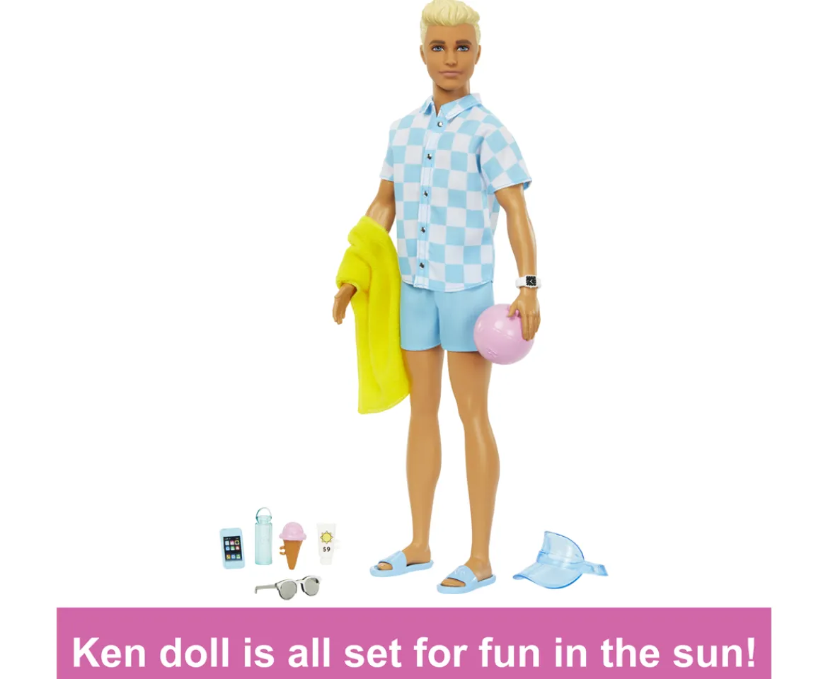 - Contents: 1 Ken doll with fashion, 1 pair of sandals, 1 visor, 1 beach ball and assorted small accessories