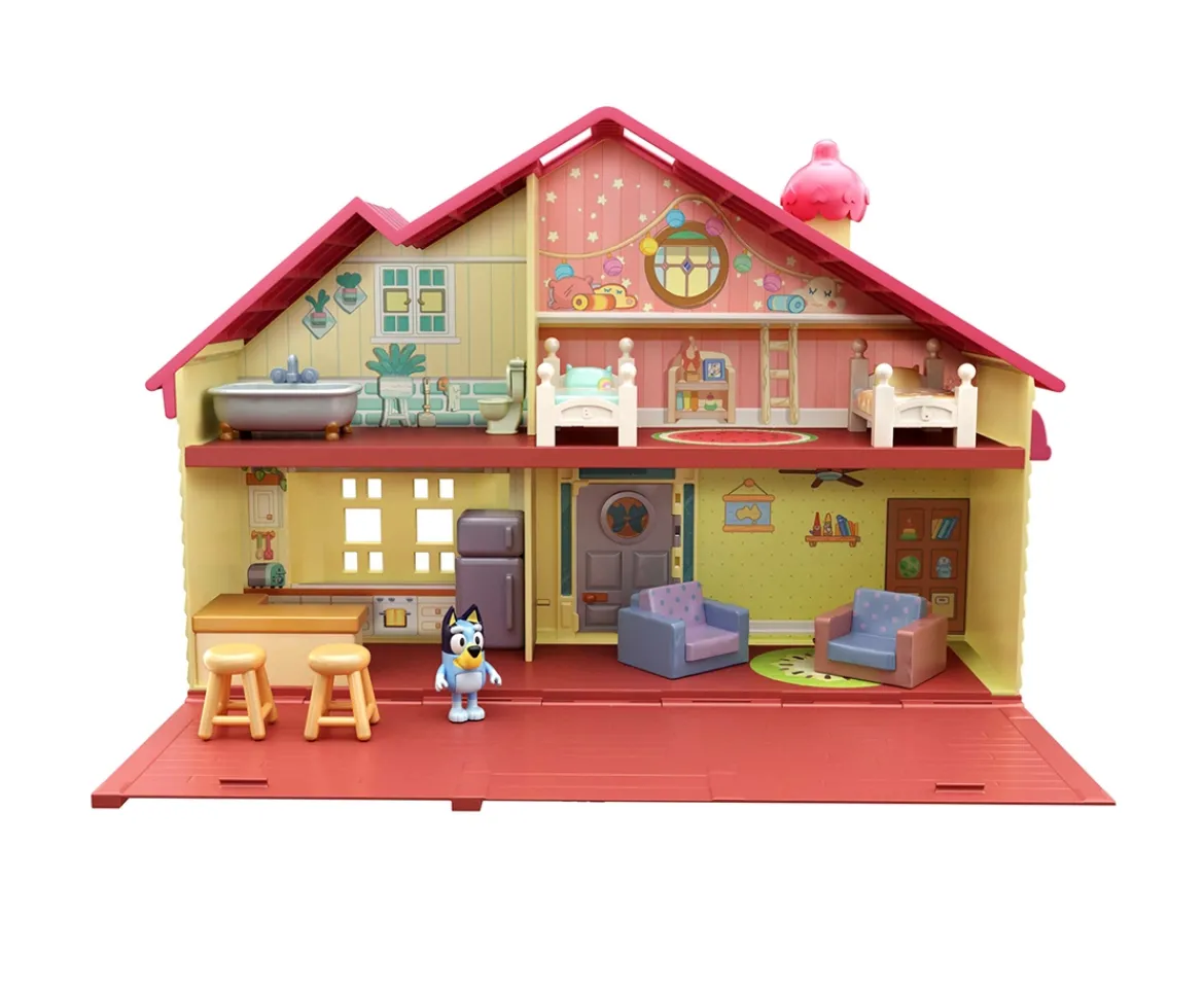 - The Bluey Family Home is the perfect playset for Bluey and her family! Big in size and features, this enormous toy playset is full moulded details with opening doors for added fun. The Bluey Family home has 4 different rooms and a large wall panel that pulls down to form an amazing outdoor patio!