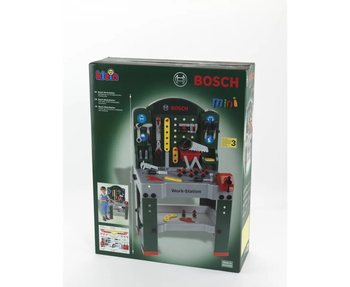 The new children’s workbench, with numerous tools and screws offers numerous play possibilities and Bosch’s big workshop is in no way inferior! The child-friendly rounded plastic tools ensure that no accidents might happen. The workbench can also work with the numerous Bosch devices, e.g. with the battery-powered cordless screwdriver, with the attachment also the screws of the workbench can be screwed.