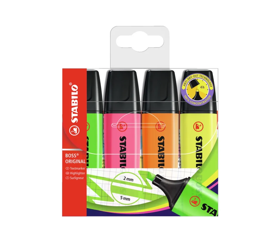 There is only one STABILO BOSS ORIGINAL, its unique and distinctive shape is recognised all over the world and has been since 1971. The STABILO BOSS ORIGINAL has super fluorescence ink and fits perfectly in every pencil case. Its long life makes it the number one choice and stands for German quality you can trust. Don’t worry if you forget to replace the cap, you are able to leave it off for up to 4 hours and the highlighter will regenerate once the cap is replaced.