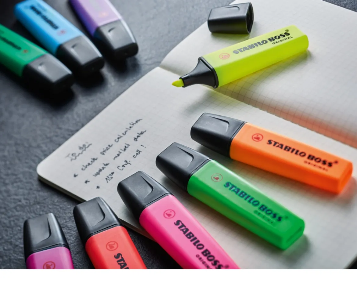 - The STABILO BOSS is the only highlighter that comes in 9 fluorescent colours to make your work colourful.