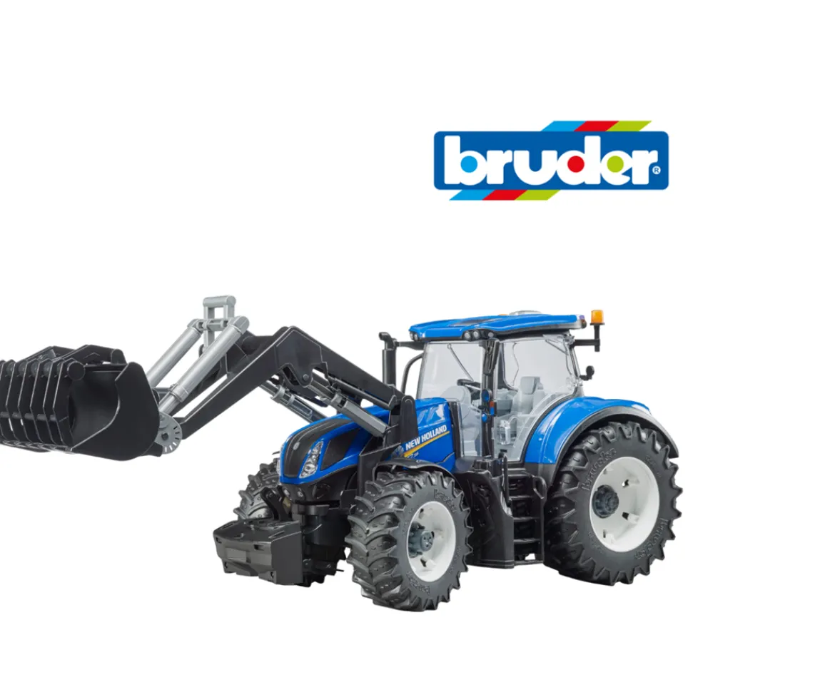 New Holland T7.315 tractor with original decal detail, enclosed cab with opening doors, bonnet opens, front suspension, front wheel steering, height-adjustable hitch, detachable front weight. Removable rear wheels, rolling wheels with authentic tread tyres. Front loader arm raises and lowers, bucket scoops and dumps.