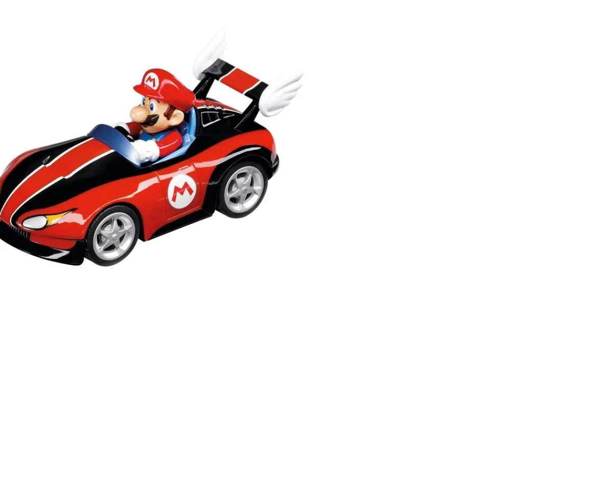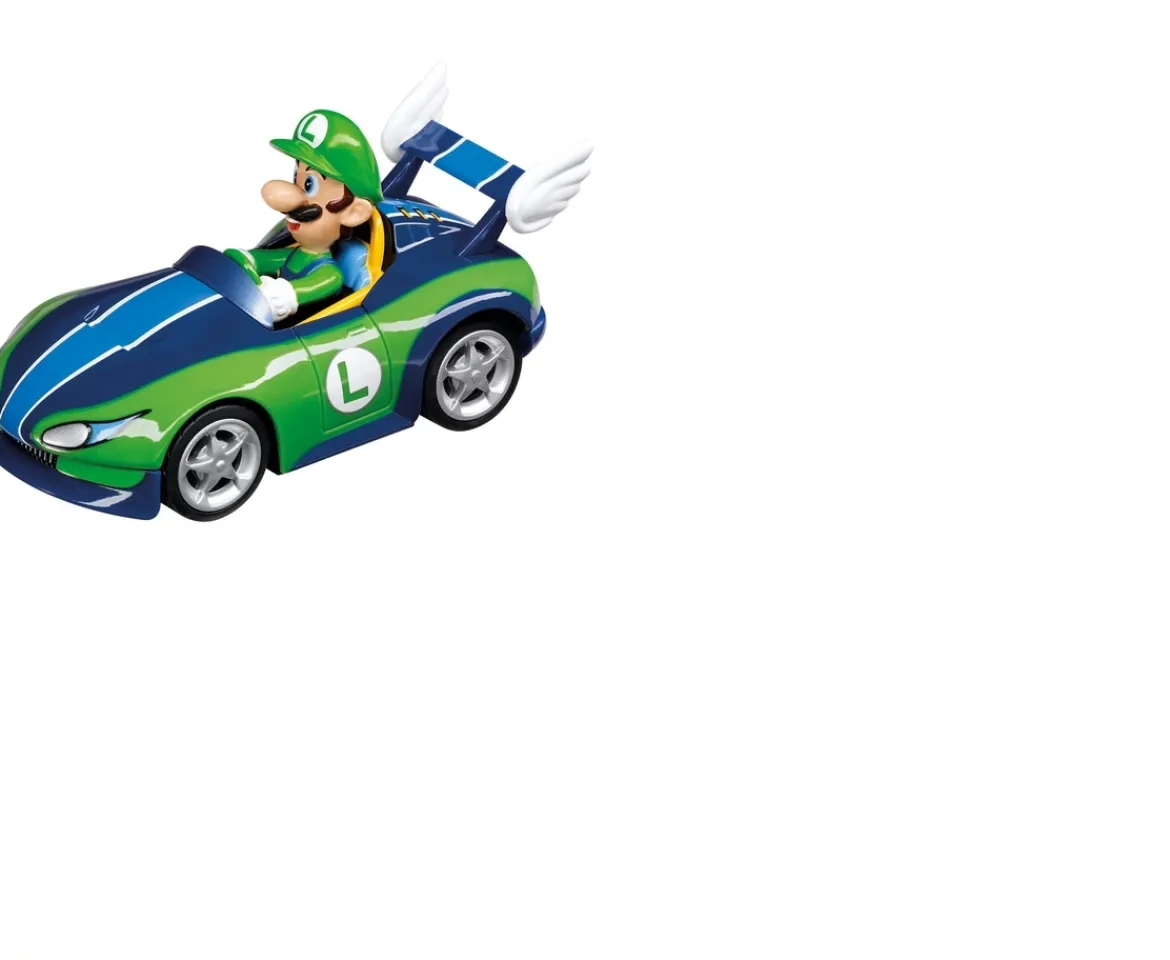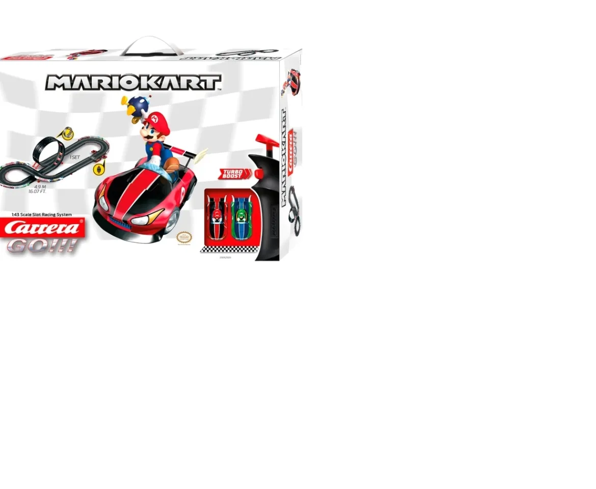 Mario Kart lights up the living room! There’s a genuine highlight for video game enthusiasts of all ages when the drivers enjoy their first ride out with the new Carrera GO!!! Nintendo Mario Kart Wii set. The well-loved racing machines made popular by Mario Kart Wii have now picked up the gauntlet for foot-to-the-floor action with this Carrera GO!!! racing circuit. These winged karts with elegant stripes on their hoods shoot Mario and Luigi around the 4.9-metre / 16.08 ft. Carrera – and all the way to the line. This challenging new racing circuit features a loop, a high-speed straight and tons of speedy bends.WARNING: This toy contains magnets or magnetic components. Magnets attracting each other or a metallic object inside the human body may cause serious or fatal injuries. Seek medical attention immediately if magnets are swallowed or inhaled.