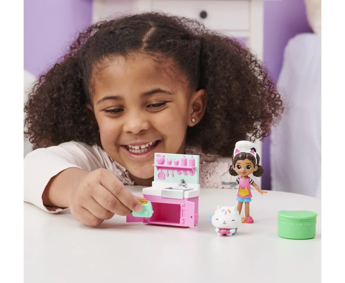 Paint a masterpiece with Gabby and the Gabby’s Dollhouse Art Studio Set. This fun toy set includes a 9.7-cm Gabby Girl collectible figure, Baby Box Cat figure, an art cabinet furniture piece, paint palette accessory, plus a Dollhouse Delivery box with a surprise accessory inside. Just like Gabby does in the show, unbox your special Dollhouse Delivery and discover the set’s mystery accessory. What will you find inside? After the reveal, use your imagination to play out your own adventures with Gabby and Baby Box Cat. Place the palette or surprise accessory into Gabby’s hand and help her to get creative in the studio. Press down on Gabby’s cat ears and watch as her smock turns from clean to paint splattered. Press the cat ears again to make the smock clean. It’s so much fun. Then, pretend to pull some craft paper from the cabinet’s roller—it really spins. This kids’ toy is the perfect gift and can be used with Gabby’s Purrfect Dollhouse (sold separately). Discover more storytelling possibilities with all of the Gabby’s Dollhouse Sets, including the Flower-rific Garden and Kitty Karaoke (each sold separately). For one last surprise, scan the QR code inside the Dollhouse Delivery to unlock a special reward in the free Gabby’s Dollhouse App (available on iOS and Android). Bring home the Art Studio Set and join Gabby from Gabby’s Dollhouse for some painting fun.