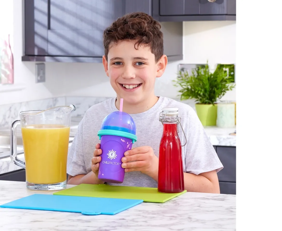 RAPID FREEZE TECHNOLOGY – Here at ChillFactor – we make cool stuff that makes things cool! The ChillFactor Slushy Maker allows you to make delicious slushies’ in seconds! People of all ages that love slushies and long-lasting super chilled drinks, should be able to make their own, using the ingredients they want, when they want …To do this, we invented Rapid Freeze Technology™ (that’s R-F-T for short) It’s simply amazing, and amazingly simple. Just freeze, squeeze and enjoy! And there you have it – delicious slushies in seconds made the way YOU want!SIMPLE TO USE – No ice, no blenders, no mess! The ChillFactor slushy maker is so easy to use – all you have to do is put it in the freezer, wait for it to freeze then add your preferred chilled drink and squeeze! Right before your eyes you will see slushy appear in seconds! Once you have made your slushy you can use the reusable spoon straw included to enjoy! The ChillFactor Slushy Maker is transportable so you can enjoy your slushy anywhere once made! THE INGREDIENTS YOU CHOOSE – With ChillFactor YOU are in control of what ingredients you use meaning you’ll always know exactly what’s in your slushy drink. ChillFactor is a great way to get kids in the kitchen, encouraging them to have fun exploring, and learning about different ingredients. You can create slushies’ from all your favourite chilled drinks. Use natural fruit juices to make yummy and healthy slushies. You can even create delicious frozen yoghurt and ice cream treats – mix in fruit pieces and decorate with toppings!  We encourage you to explore different flavour combinations -the possibilities are endless!REUSABLE – The ChillFactor Slushy Maker is reusable. Simply wash in warm soapy water after each use, re freeze and its ready for you to make your next slushy. Use your slushy maker time and time again – with ChillFactor the fun never ends! Our ChillFactor products are all super simple and safe to use. It’s all the fun without any of the hassle!FUN FOR ALL THE FAMILY – People of all ages can enjoy ChillFactor! Kids will absolutely love the ability to make super quick home-made slushy treats. And for a more adult take on slushies, it’s perfect for creating slushy cocktails for parties and BBQ’s! The ChillFactor slushy maker is the perfect present for all the family! The Power Purple Colour Shock slushy maker comes is a super  vibrant purple colour with contrasting mint green collar and pink spoonstraw for a total colour shock! Also features super cool lightning bolt print. Drink your slushies in style!You can create slushies’ from all your favourite chilled drinks. Use natural fruit juices to make yummy and healthy slushies. The Slushy Maker is reusable. Simply wash in warm soapy water after each use, refreeze and its ready for you to make your next slushy. Use your slushy maker time and time again – with ChillFactor the fun never ends.               Â
