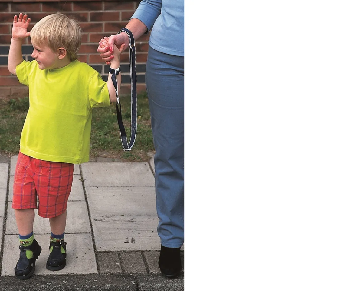 Designed for toddlers and young children who can already walk. Both the adult and child wrist bands are easily adjustable, as is the length of the connecting rein which incorporates a shock absorber, which allows the connecting rein to stretch slightly should your child fall or pull away sharply.