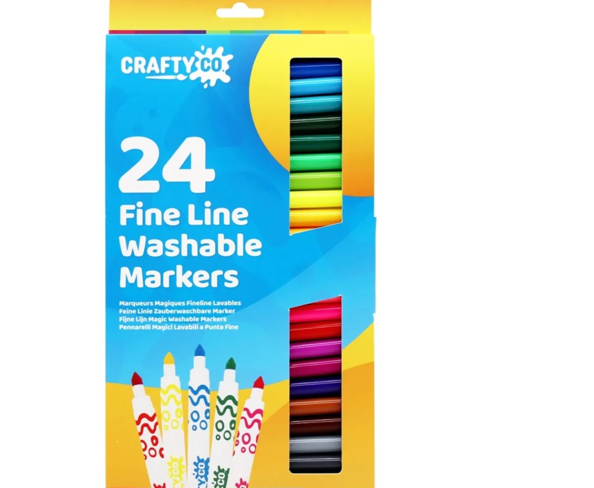 Let your creativity flow effortlessly with Crafty Co. Fine Tip Washable Markers! These 24 fine tip markers are incredibly versatile, allowing you to create both thick and thin lines with ease. They’re ideal for adding intricate details to your work.Experience a smooth and vibrant colour application without any annoying squeaks or drags on your paper. Even better, these markers feature ink that easily washes off both skin and clothing, ensuring a mess-free creative process.