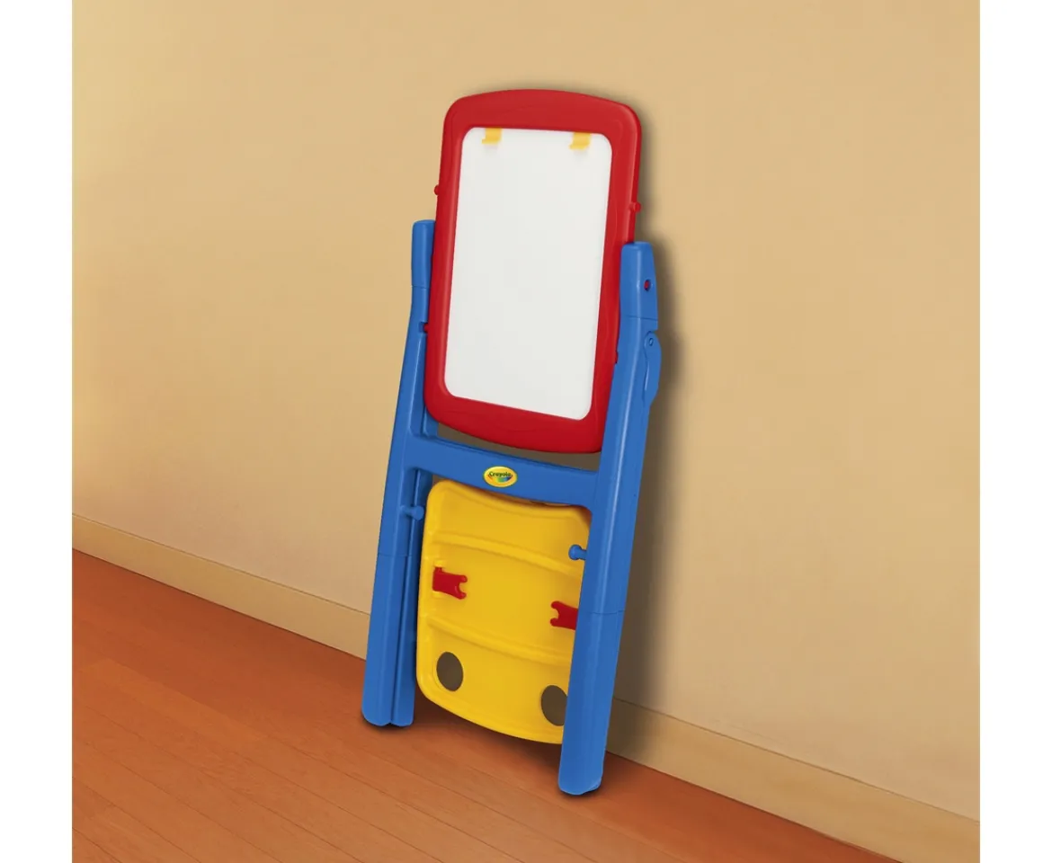 Crayola QwikFlip 2 Sided 4 in 1 Easel has a magnetic board, a whiteboard, a chalkboard and includes a paper clip on the painting surface. Drawing surface rotates 360 degrees to switch between whiteboard and chalkboard. With the Crayola Quick Flip Easel you have the perfect surface for a variety of drawing and painting projects. Foldable design for compact storage