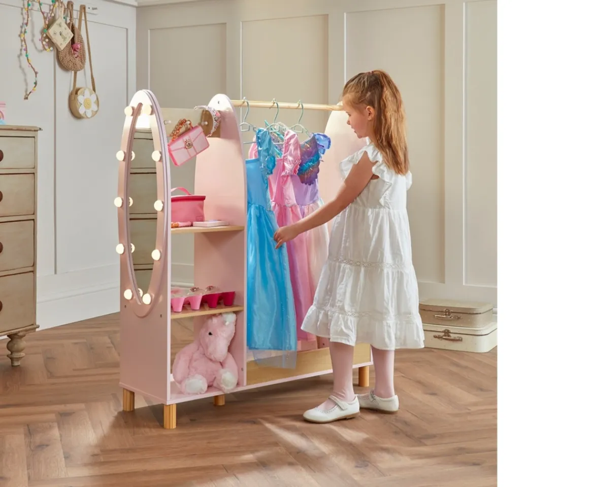 - Contents: 1x Pink Wooden Dress Up Rack with Light-Up Mirror