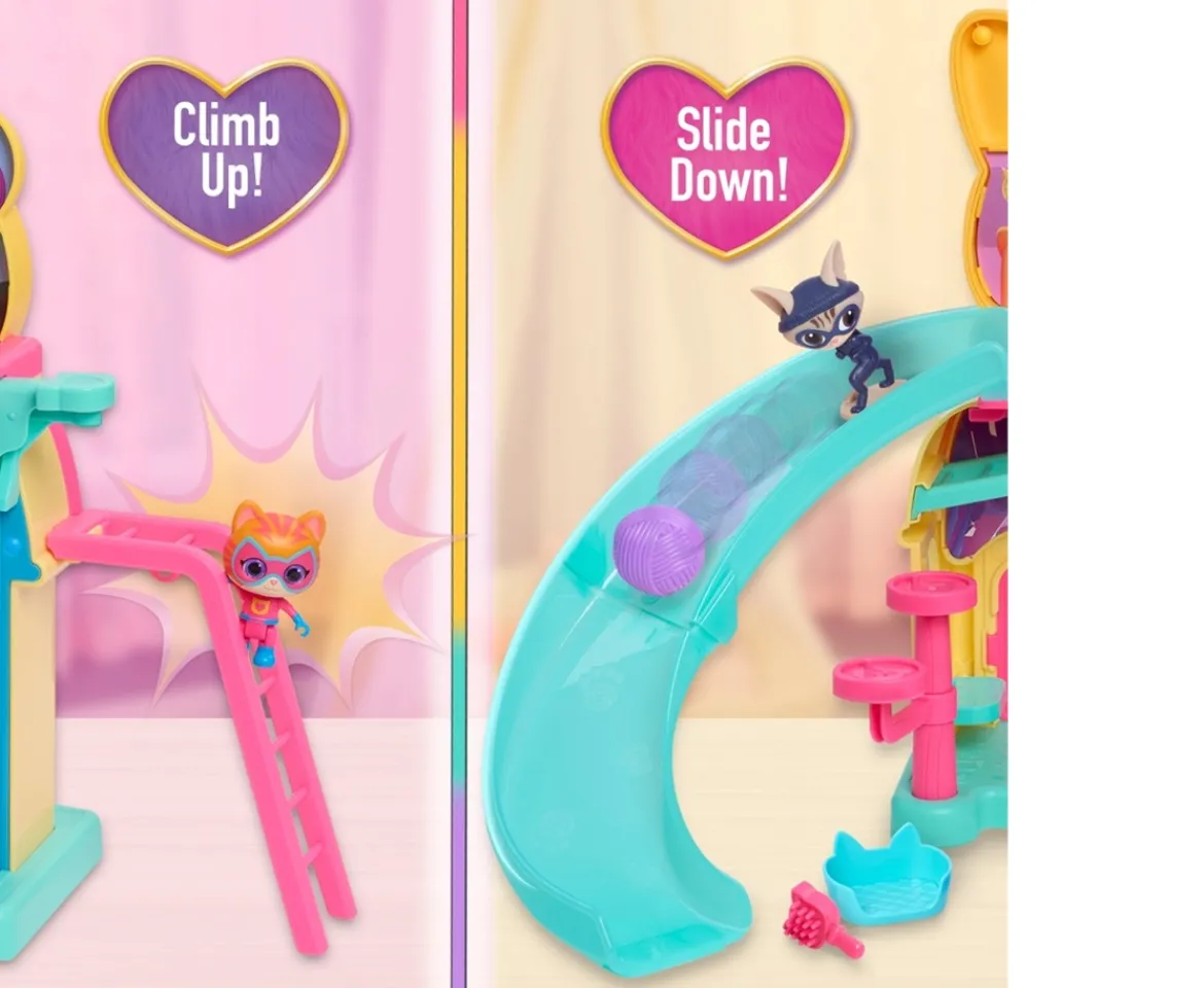 The Disney Junior SuperKitties Purr N Play Playset puts kids in the center of the action with lights, phrases, music, and sound effects. This playset unfolds to reveal a colourful play space, articulated Hero Ginny, Kitten Ginny, and Cat Burglar figures, and several accessories. There’s also a slide, climbing ladder and a Mission Control monitor where SuperKitties can learn about their next mission to protect Kittydale.Press buttons to activate multi-coloured lights and hear phrases, sounds, and music from the SuperKitties show. The top floor is an indoor playground. Downstairs, discover the secret SuperKitties Cavern! Use the transformation chamber to change Ginny into a SuperKitty. To create the effect, pre-load Hero Ginny into the chamber. Drop Kitten Ginny from the top and watch Hero Ginny emerge! Kids will have a great time defeating Cat Burglar with a well-timed yarn ball roll.