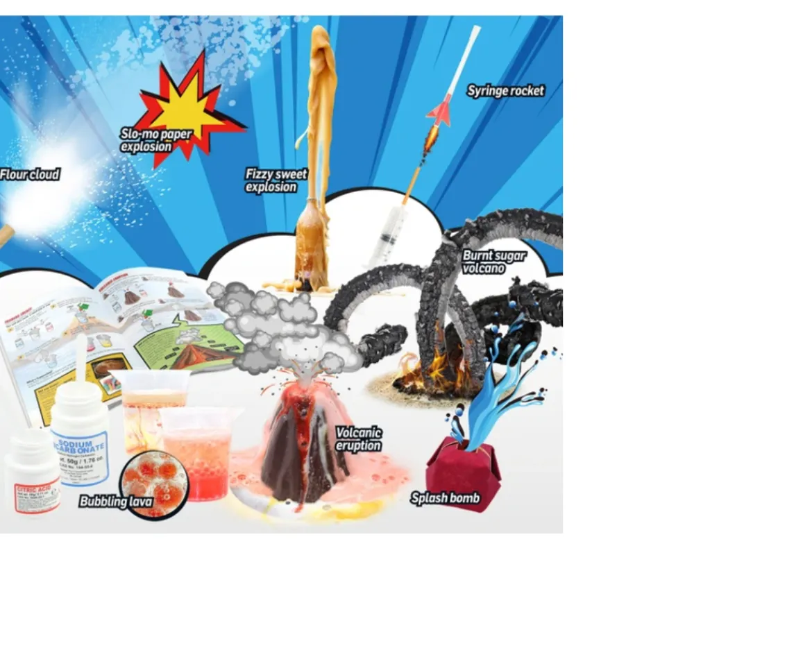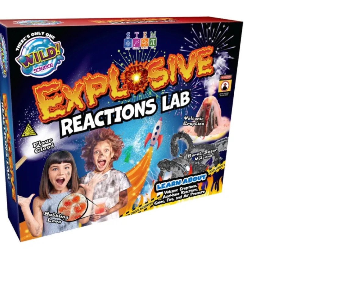 The Explosive Reactions Lab will have you bubbling with excitement for scientific exploration. Use foamy acid-base reactions to make a volcanic eruption.Use real fire to discover the chemistry of a candle flame and put out a fire using invisible gases. Discover how water can stop a balloon from popping and use the power of air pressure to launch a rocket. Make crazy clouds of flour, a colour storm in asaucer, bubbling lava in a beaker, and more.