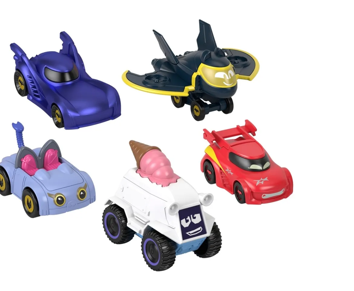 - Diecast vehicle pack featuring Batwheels characters in 1:55 scale Batcast Metal diecast format