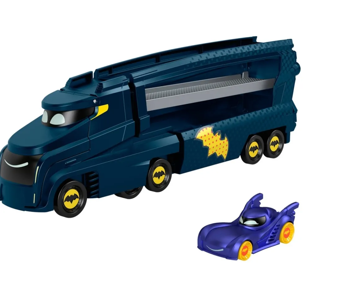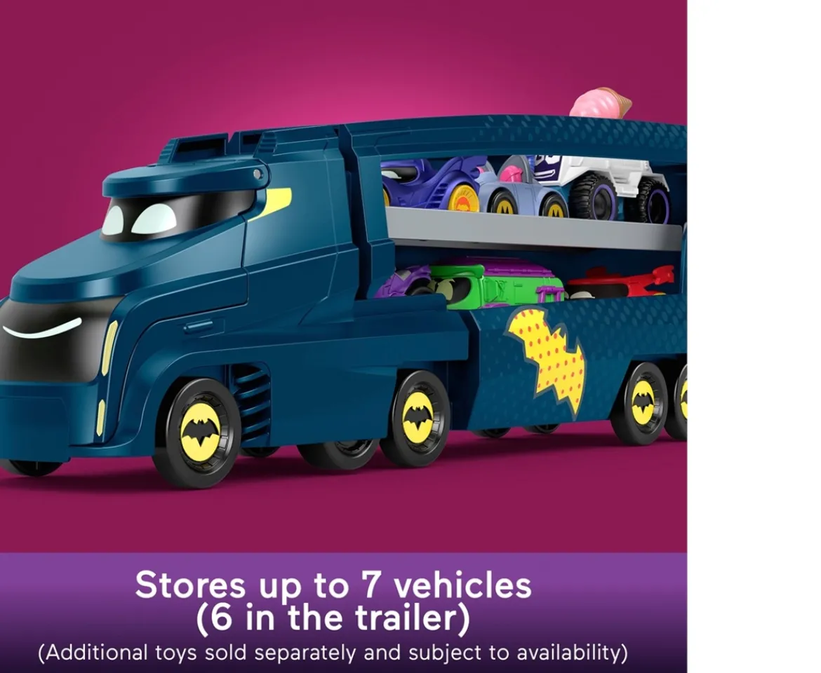 - ?Push-along Big Rig toy car carrier and vehicle storage inspired by DC’s Batwheels series ?Includes Bam the Batmobile 1:55 scale diecast car; place him in the front cab to ride along to the next mission ?Fits up to seven 1:55 scale vehicles (1 in cab, 6 in trailer), so kids can store all their Batwheels toy cars (Additional vehicles sold separately and subject to availability.) ?Fun ramp play: Open the back door to load and unload vehicles, plus send Bam racing into action ?Encourages imaginative play and storytelling for preschool kids ages 3 years and older Fisher-Price DC Batwheels Bat-Big Rig Toy Hauler & Car with Ramp & Vehicle Storage ?1 hauler, 1 diecast vehicle