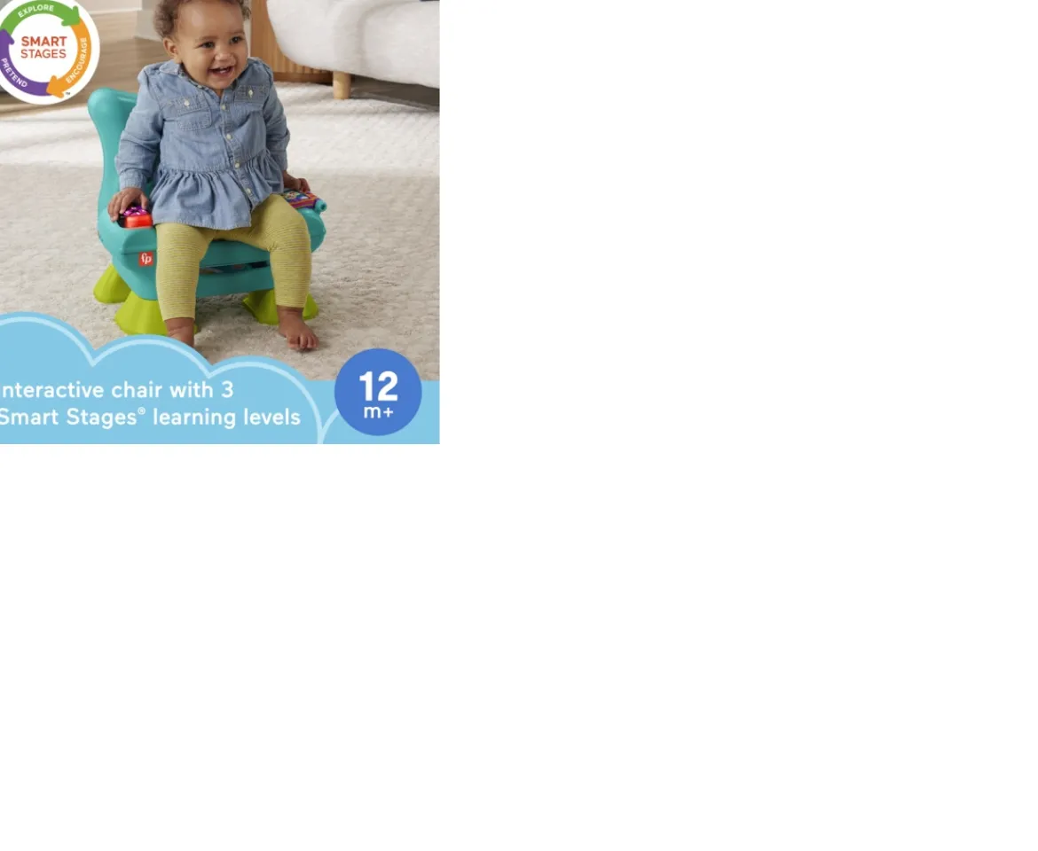 The Laugh & Learn Smart Stages Chair from Fisher-Price is your baby’s very own spot to get cozy, play and discover. The interactive seat knows when little ones sit down or stand up, so the chair can respond with fun songs & phrases! As they take a seat, babies and toddlers have lots of fun activities to explore, including a light-up remote with number & shape buttons, a flipbook, and a lift-up cushion with hidden surprises. Three Smart Stages learning levels feature 120+ songs, sounds and phrases that introduce colors, shapes, numbers, counting and opposites as kids play. Colors and decorations may vary.