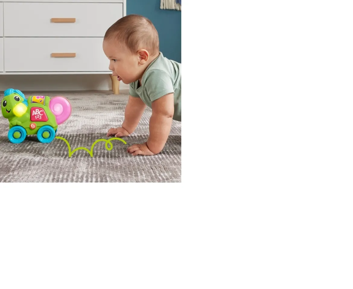 The Fisher-Price Link Squad Crawl ‘n’ Colours Chameleon interactive baby toy is a fun push-along vehicle and musical toy all in one! When kids spin the colourful roller or press the side button, Chameleon’s tail and microphone light up to sync to the beat with fun songs, sounds and phrases about colours and more.Send Chameleon rolling along to encourage your little one to crawl and chase their pal! Plus, when Chameleon meets up with other members of the Link Squad band, they light-up to sing and play together for more learning fun! (Each sold separately)