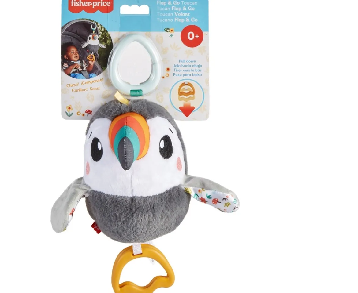 - ?Take-along plush toucan stroller toy with fun wing-flapping motion and sensory details to engage and delight your baby ?Pull and release the feet to see the toucan’s wings flap up and down ?Sensory play for newborns: soft plush fabrics, crinkle beak, clacker feet, and chime sounds in belly when batted or rattled ?Easily attaches to stroller canopy or diaper bag with convenient link ?Helps strengthen fine motor skills and foster sensory skills while introducing cause & effect; for newborns from birth and up Fisher-Price Baby Stroller Toy, Flap & Go Toucan, Activity Toy with Sensory Details for Newborns ?1 toy