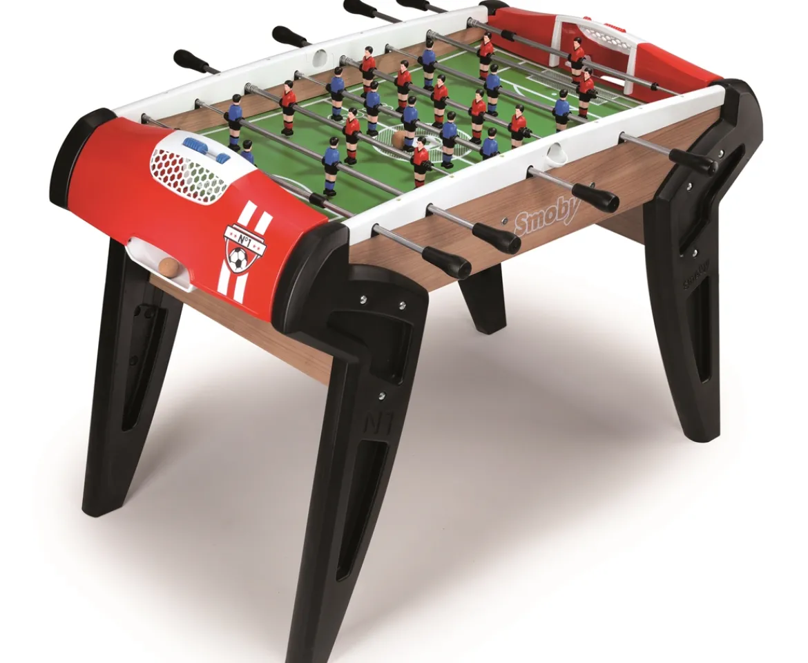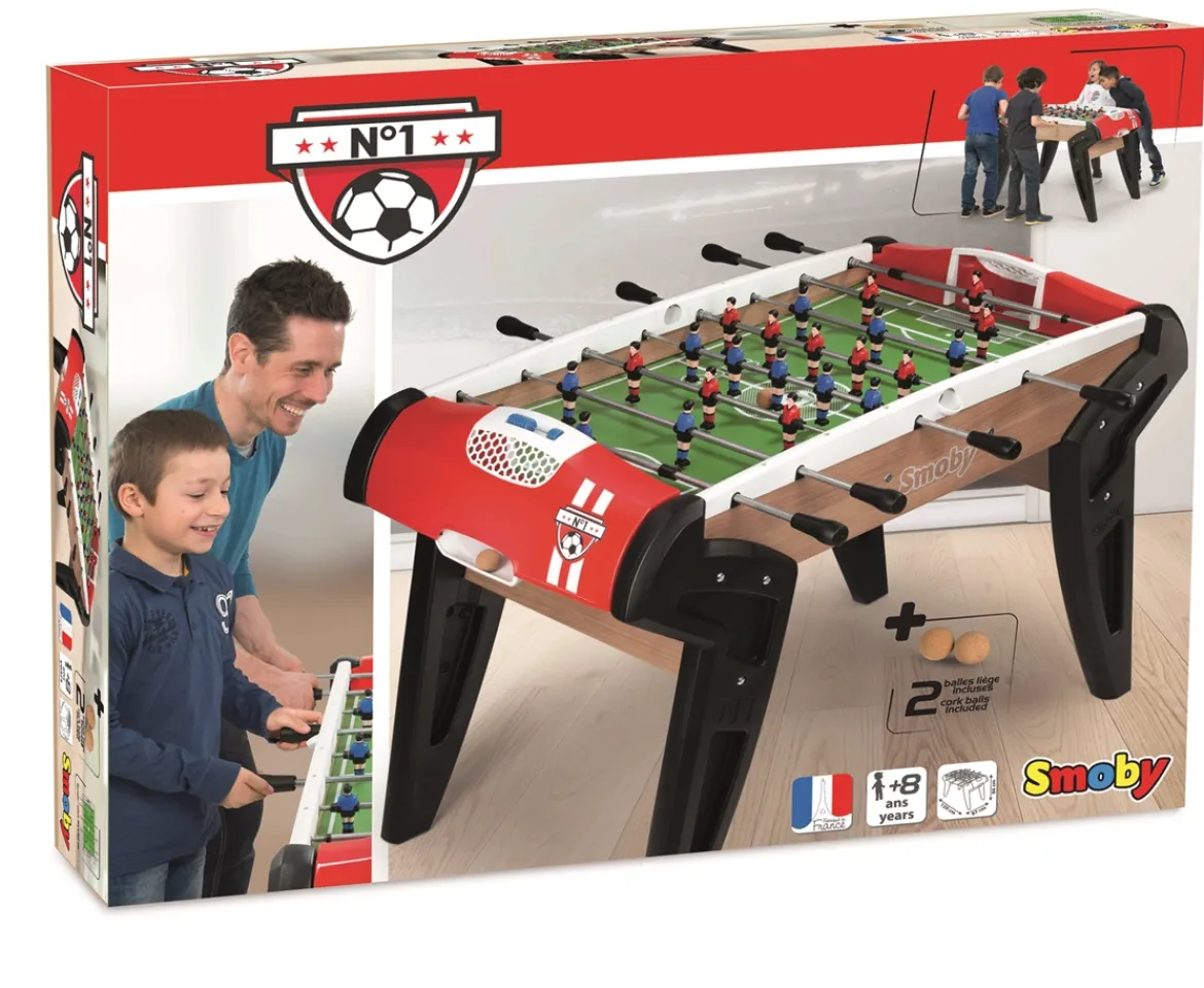 Join the N°1 team, THE reference for introduction to football table.Good stability and sturdiness, as well as modern lines and colors.It is equiped with ergonomic handles, ball pitcher and score counter.Players are already assembled.2 cork balls included.Dim : 120 x 87 x 86 cm