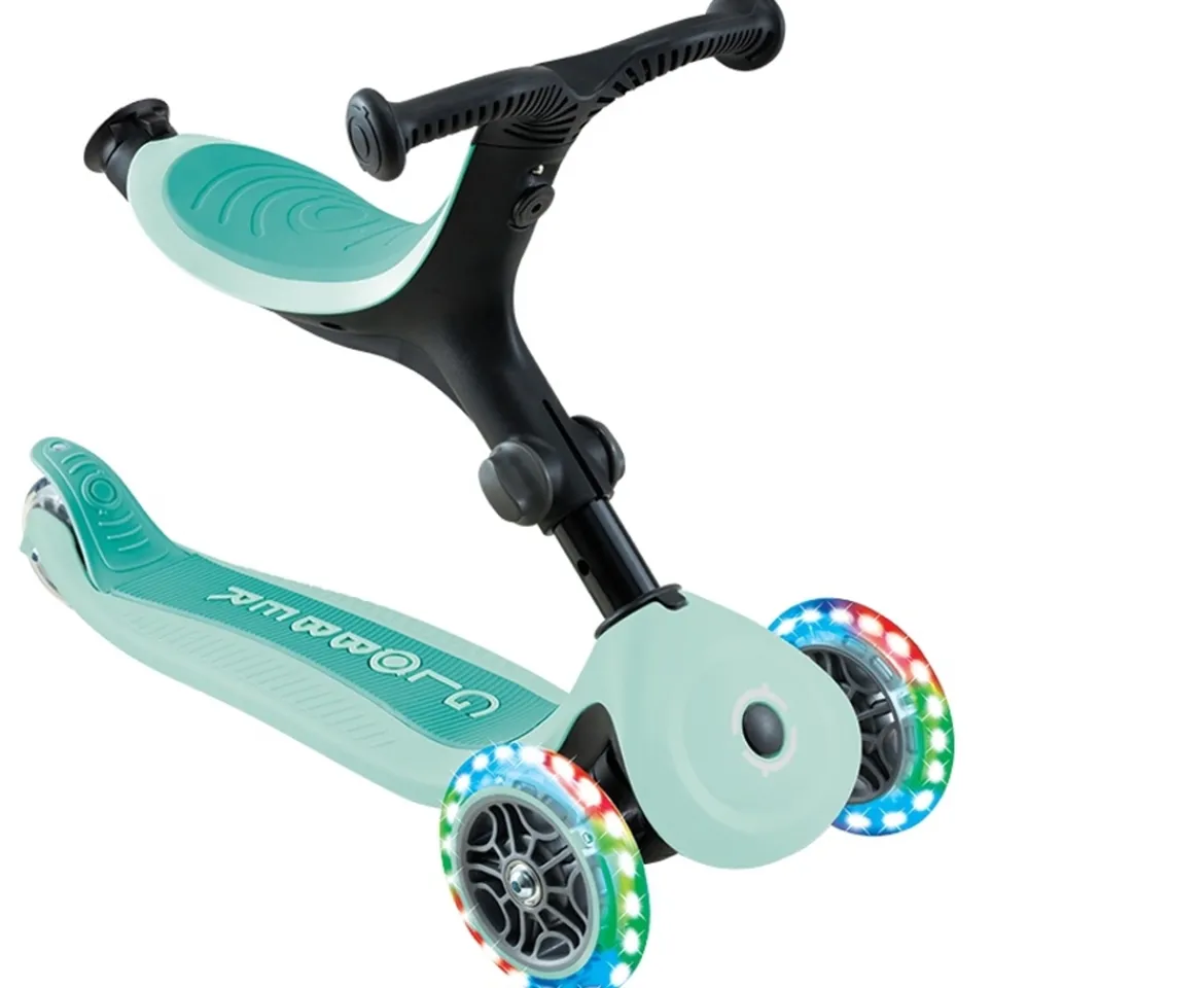 The Globber GO UP ACTIVE 360° LIGHTS is a 3-wheel light-up foldable scooter with a seat for toddlers and kids that transforms into a ride-on, walking bike, and toddler scooter. Ride-on and walking bike modes are designed for toddlers aged 15-36 months and scooter mode is recommended for kids aged 3-9 years plus. Enjoy never-ending playdates with a childhood buddy that’s here for years to come!Ride-on ModeRide-on mode allows parents to steer the scooter with a parent handle while kids sit comfortably on the seat. Toddlers still developing the balance and coordination needed to ride a scooter independently can still enjoy the fun of scooting around with a little help!Walking Bike ModeBuild confidence and improve your little one’s balance with walking bike mode! With the walking bike, kids can use their feet to push themselves along to gradually get them used to the feel of a bike and learn how to balance. It’s a fun and safe way for kids to learn to ride, building the confidence they need to progress to regular scooting in no time!Scooter ModeSwitch to scooter mode and ride your GO UP as a kick scooter! Scooter mode allows your little one to ride the GO UP as a 3-wheel kick scooter as they grow older and feel more confident – no extra purchase needed! It’s the perfect way to transition your little one from a ride-on to a traditional scooter.