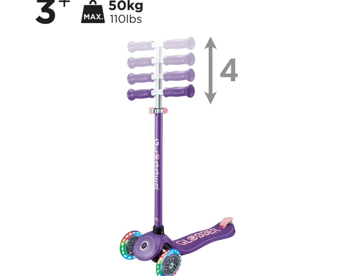 The Globber PRIMO PLUS LIGHTS Scooter is built for kids aged 3 to 9. Thanks to its anti-slip, reinforced scooter deck and robust integrated brake, kids can safely scoot for hours of fun!Light-Up WheelsThe Globber PRIMO PLUS LIGHTS Scooter has light-up front wheels that flash in blue, green, and red for a colourful ride all day long. The lights are powered by dynamo for battery-free play.Height AdjustableThe 4-height adjustable, aluminium T-bar (67.5cm, 72.5cm, 77.5cm, or 82.5cm) provides an even longer-lasting scooter companion for kids because it grows as they do.Steering LockThe front wheels of the light-up scooter are fixed in a vertical to-and-fro movement, allowing your child to practice balance and gain confidence. Once they’re ready to ride, simply release the steering lock button so they can start turning the wheel and burning the track!