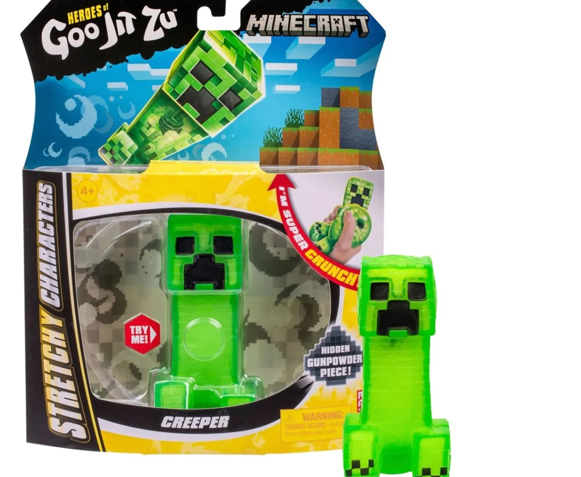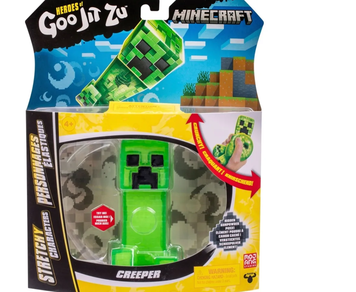 Get ready for the ultimate squishy adventure with Heroes of Goo Jit Zu Minecraft Creeper! Some of your child’s favourite Minecraft characters are now the squishiest, stretchiest figures ever. Squeeze and squish Creeper to discover a hidden “Gunpowder Piece” inside his super crunchy body!Stretch him up to three times his size, and watch as he returns to his original shape. Each Minecraft figure in this collection has a unique filling for a fun sensory experience – squishy Steve, crunchy Creeper and more (each sold separately).Perfect for imaginative play, these collectible Heroes of Goo Jit Zu Minecraft toys bring a new gooey twist to the world of Minecraft. Keep an eye out and collect them all for endless stretchy, squishy fun!