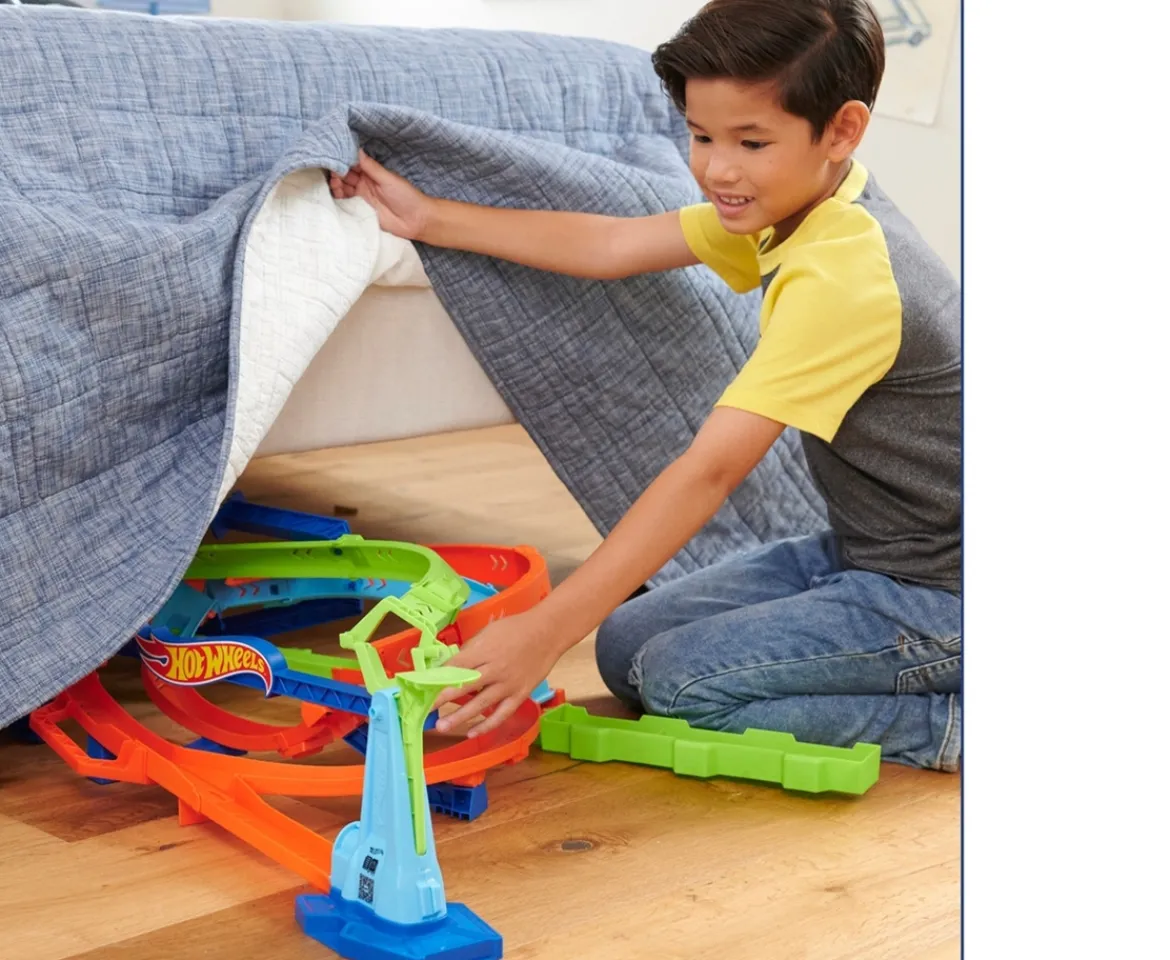 - Race & stunt on the Hot Wheels Action Loop Cyclone Challenge Track Set with 2 ways to play!