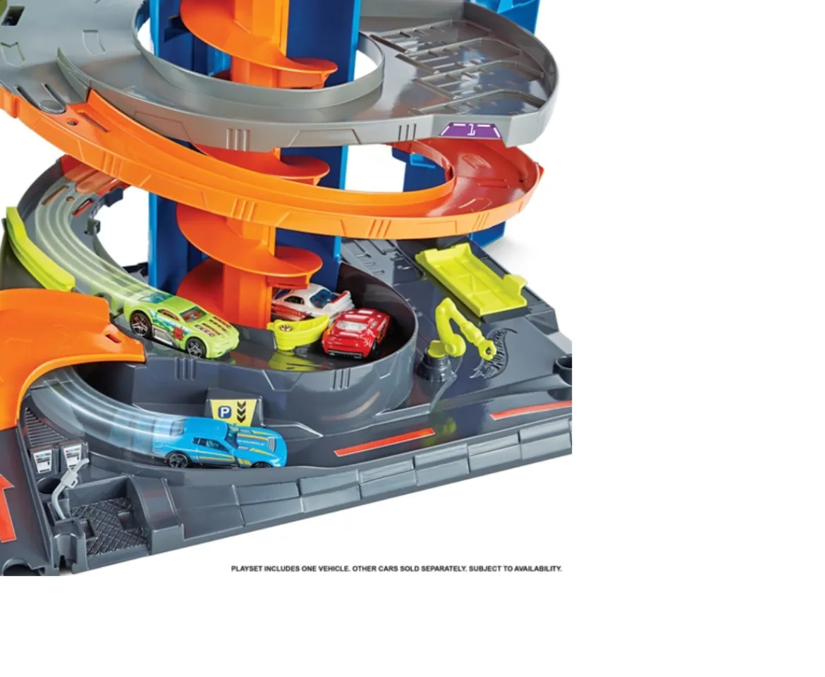 The Hot Wheels City Mega Garage playset is four levels of parking garage awesomeness! This toy garage comes with one 1:64 scale vehicle but can hold 40+ more (additional cars sold separately).So Much to ExploreAt the centre of the Hot Wheels City Mega Garage is a corkscrew elevator. It carries cars between different floors and releases them onto a track. Kids control it with a hand crank and determine whether cars continue to other adventures or if they roll into a parking spot where they’re put on display.Build Your Hot Wheels SetMultiple connection points on the base of the Hot Wheels City Mega Garage allow kids to connect the playset to other Hot Wheels sets (sold separately). Plus, this toy garage features an additional four outlets to connect orange track pieces to it for the ultimate stunting and building. Colours and decorations may vary.