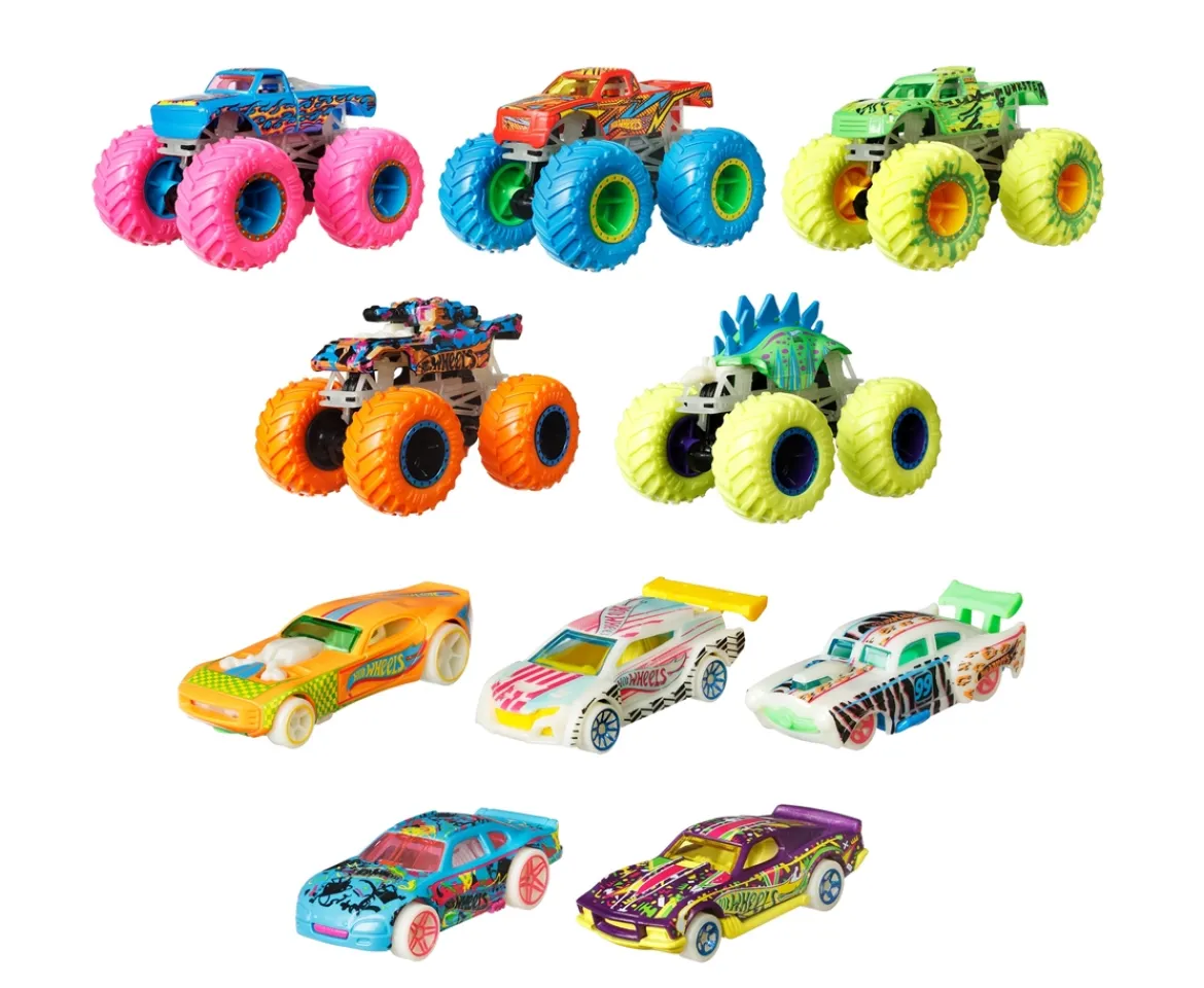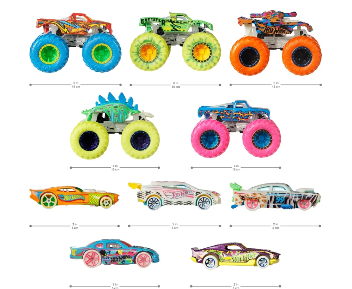 - Hot Wheels Monster Trucks literally turn out the lights with 10 Glow in the Dark 1:64 scale die-cast vehicles!
