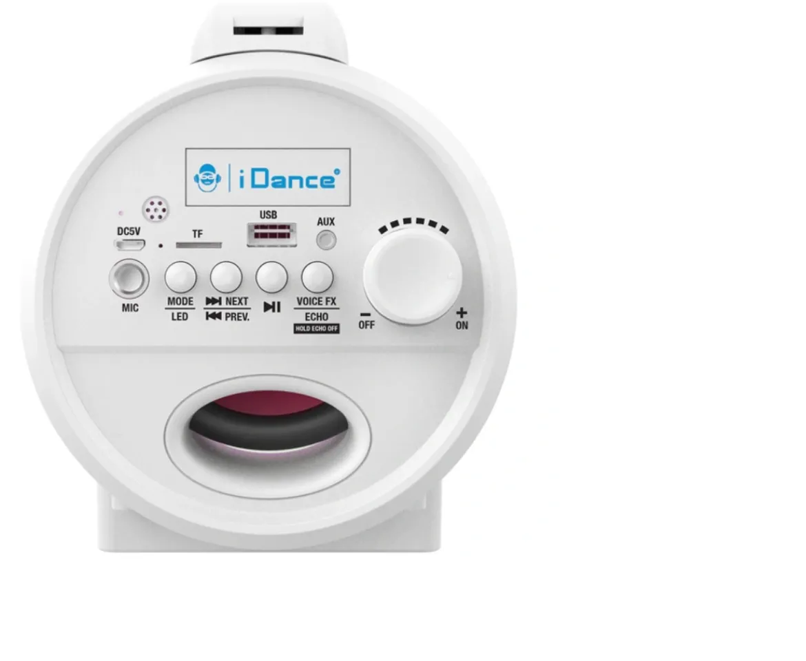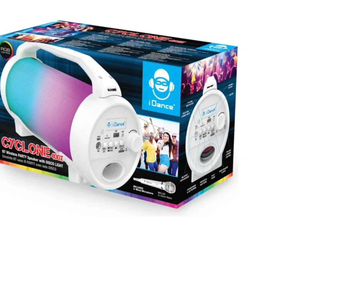 The iDance Cyclone 400x Bluetooth Party Speaker comes with Strong Bass and has Bluetooth wireless playback. With RGB LED lights, this Bluetooth speaker will turn you into the life of every party.Bluetooth Speakers for PartiesPlay and connect music from your mobile phone or tablet to this Bluetooth speaker. MP3 Playback through TF Card or USB (not included), so you can play your music in different ways.Light-Up Portable SpeakersThis portable speaker has a disco light show with RGB lighting when switched to party LED mode. Light up the room – not just with your playlist, but with actual flashing lights.Karaoke FunThis Bluetooth speaker also features a microphone, transforming effortlessly into a portable karaoke machine. The mic comes with an on/off button for voice changer and echo effects. Compatible with audio input/AUX IN for your portable speaker.