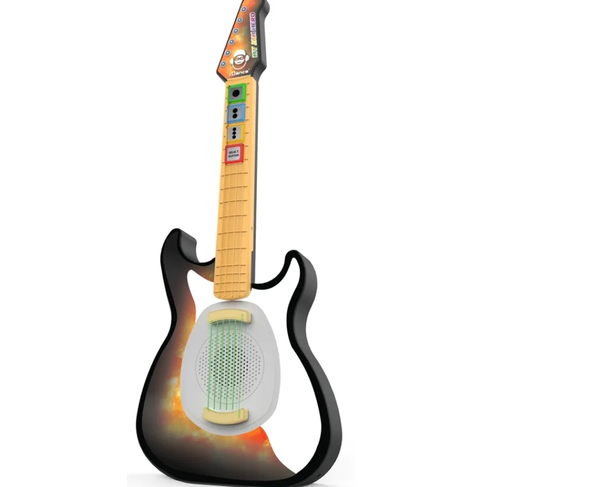 The iDance My Jam Hero Virtual Guitar is your ultimate rock star experience brought to life! Featuring 10 virtual guitar modes with drums and backing, and 3 magic chords with acapellas, the iDance My Jam Hero Virtual Guitar offers endless musical possibilities. Whether you’re riffing on classic tunes or composing your own hits, this virtual guitar puts the power of music at your fingertips.With the built-in guitar tuner and speaker with three volume levels, you can amplify your jams anywhere, anytime. Take your skills to the next level with the free iPad app ‘Jam Hero’ for interactive lessons and tutorials. Mastering the guitar has never been easier or more fun! Use the aux input for audio mixing and the headphones output for silent mode to practise and perform with precision. Complete with a guitar strap for performances, the iDance My Jam Hero Virtual Guitar is ready to rock wherever you go.