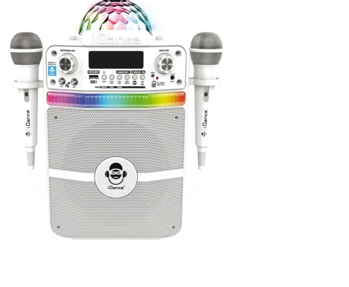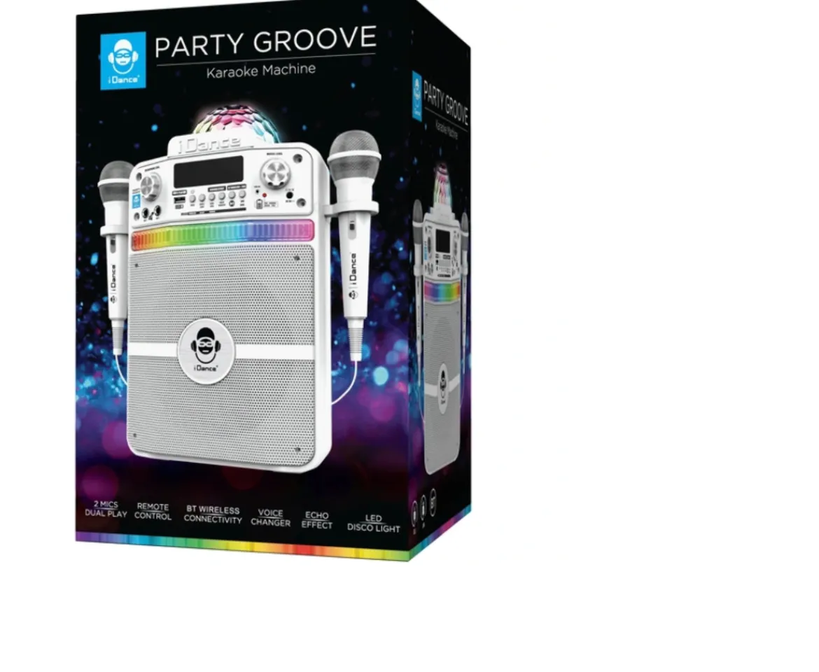 - Contents: 1 x iDance Party Groove Karaoke Machine, 2 x Wired Microphone, 1 x Plug charging cable, 1 x Remote control and 1 x User manual