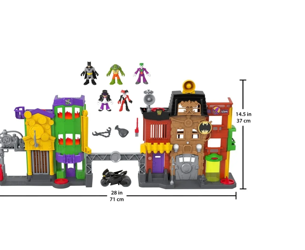 Young crimefighters can bring all the exciting Gotham City action to life at home with this Imaginext DC Super Friends Crime Alley playset from Fisher-Price. Batman leaps into action on the Batcycle, as he stops yet another evil missionBatman Figures IncludedThe Joker, The Penguin, K. Croc, and Harley Quinn have long been inflicting havoc in Gotham City from their hideouts in Crime Alley. Now, Batman takes the battle to them, speeding into action on his Batcycle to clean up the streets for good.Detailed Crime Alley PlaysetYoung crime fighters will have a blast plotting and scheming with their favourite Super-Villains! Then, reverse the roles to help Batman save the day.